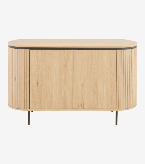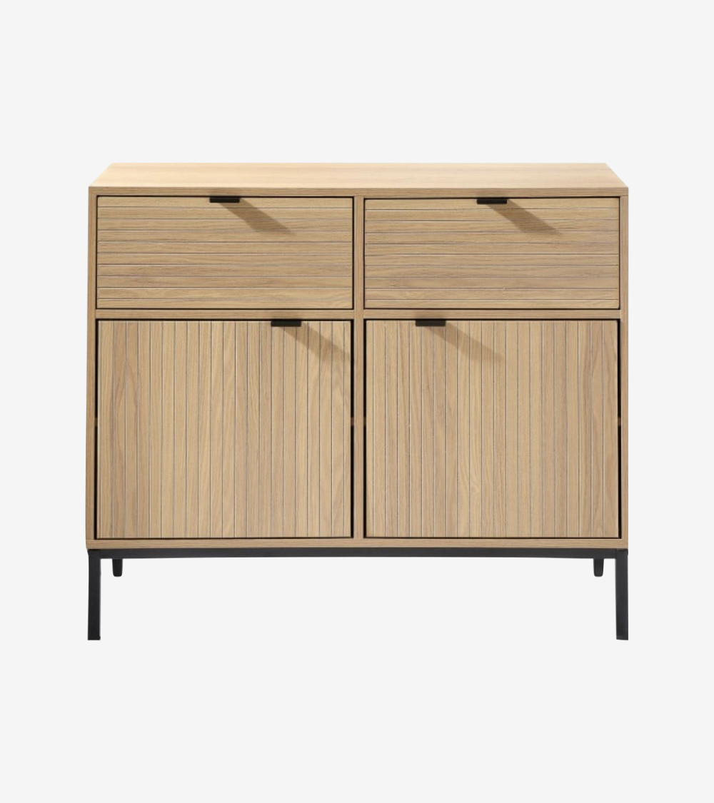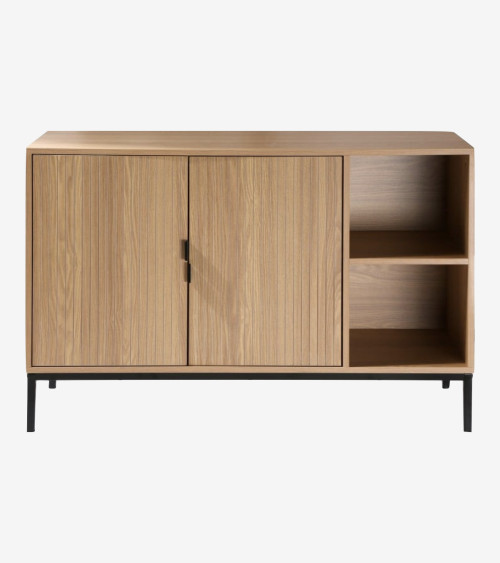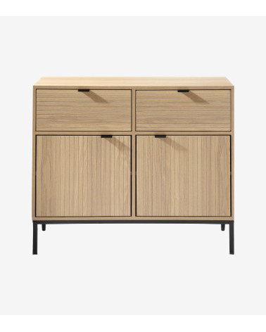 Meuble réalisé en panneaux de particules, façade en MDF avec piétement en métal noir. Façades de tiroirs avec effet de lame horizontales et portes avec de lames verticales. Poignées en métal noir, piétement en métal noir.