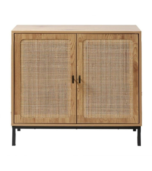 Ce buffet associe bois naturel et métal noir pour un rendu moderne et élégant Idéal comme buffet ou rangement il apporte une touche chaleureuse et contemporaine à votre salon Sa structure robuste et ses portes tressées offrent un espace pratique et tendance