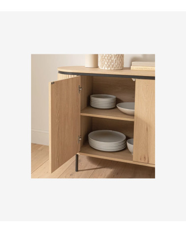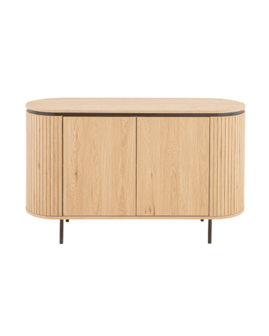 Compact et élégant, ce buffet reprend le style scandinave contemporain avec ses côtés arrondis et son alliance raffinée de bois clair et noir. Sa conception en panneaux de particules et MDF de qualité assure solidité et durabilité, tandis que ses pieds fins en métal noir de 20 cm apportent légèreté et modernité.