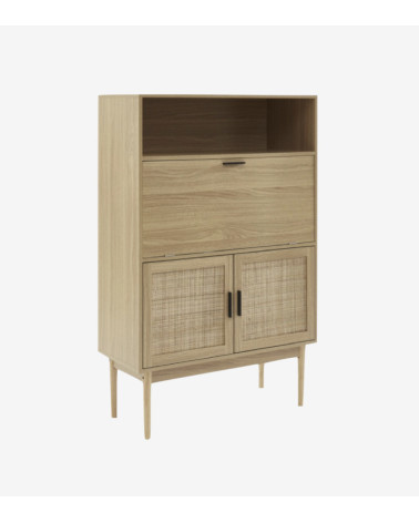 Le secrétaire se distingue par son design bohème authentique et raffiné, qui combine harmonieusement le revêtement en papier décor effet chêne et le cannage rotin. Ce style bohème apportera une touche de chaleur et de caractère à votre espace de travail, tout en s'intégrant parfaitement à divers styles d'intérieur.
