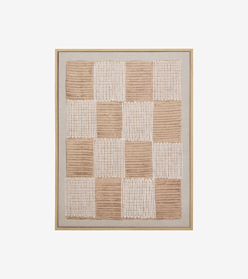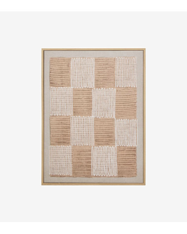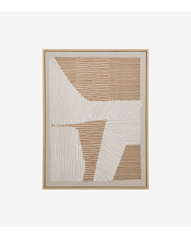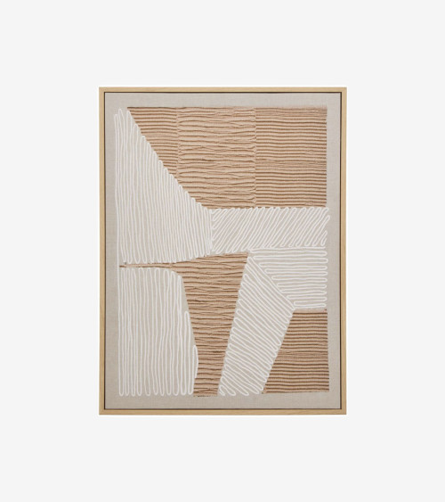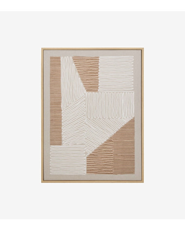 Cette toile imprimée rectangulaire arbore des motifs abstraits avec des couleurs terreuses. Le cadre imitation bois finalise l'ensemble afin d'être prêt à accrocher.