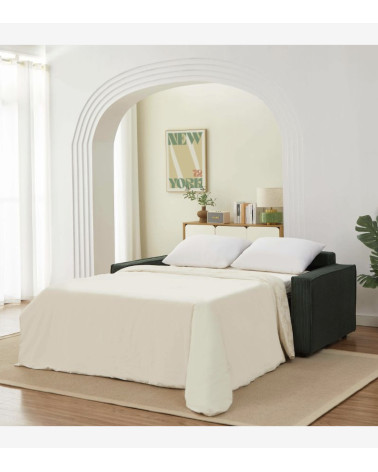 Pensé pour un usage régulier, il est doté d'un mécanisme d'ouverture express permettant de passer du canapé au lit en quelques secondes, sans retirer les coussins. Il se transforme en un couchage de 140 x 190 cm, parfaitement adapté à un usage quotidien.