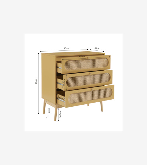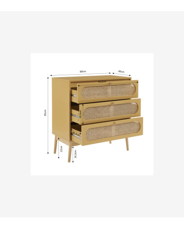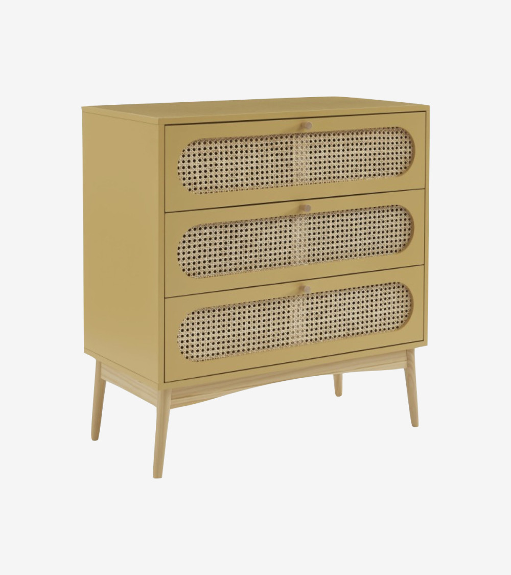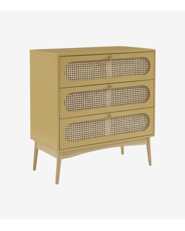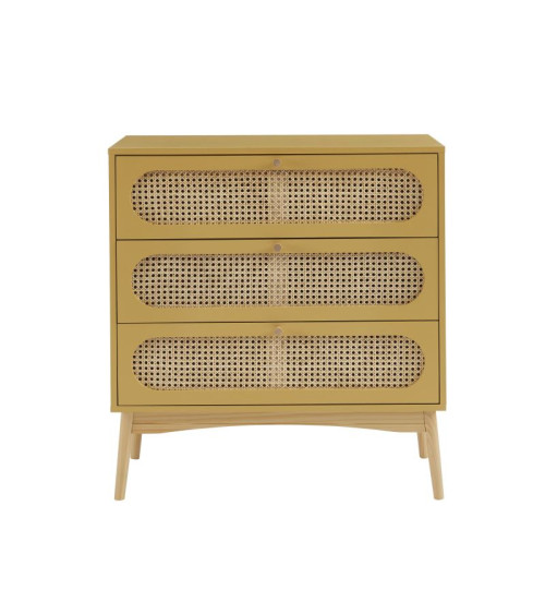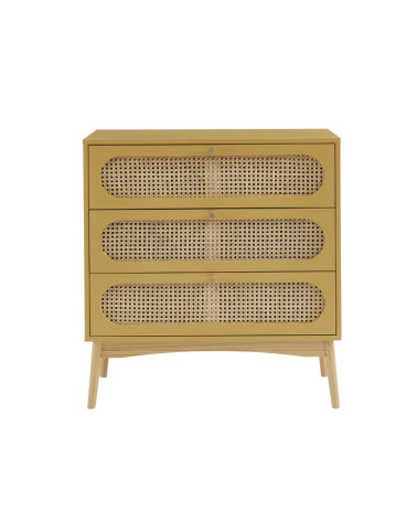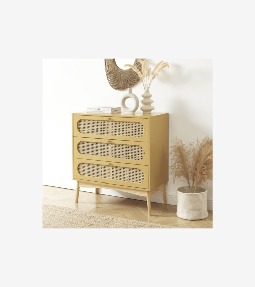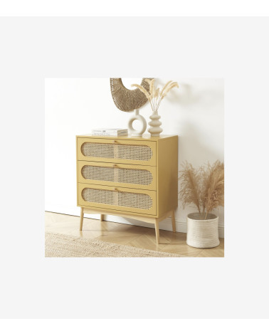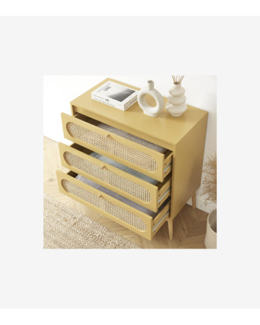 Commode 3 tiroirs jaune safran et cannage rotin L80 x P40 x H85 cm