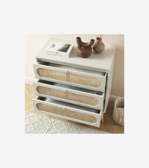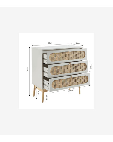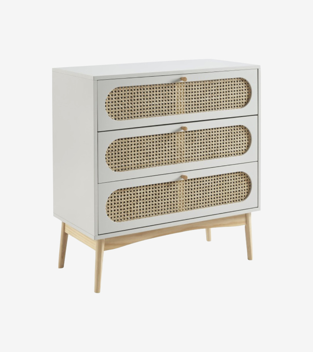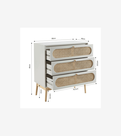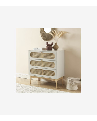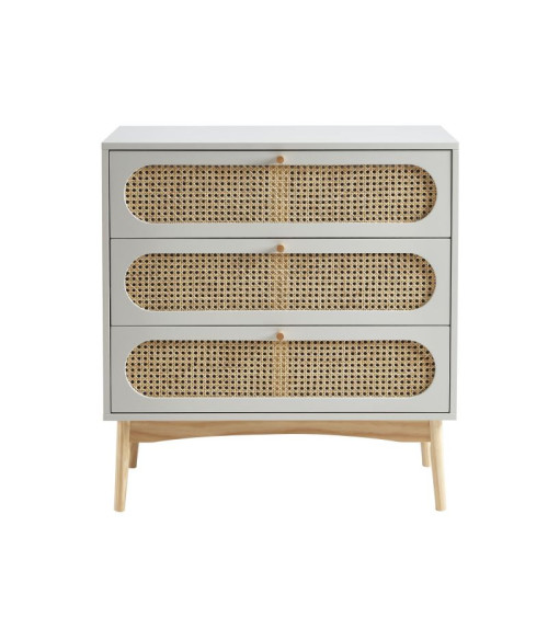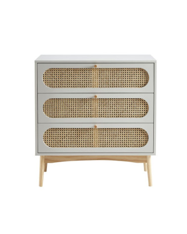 Commode 3 tiroirs cannage rotin et gris perle L80 x P40 x H85 cm