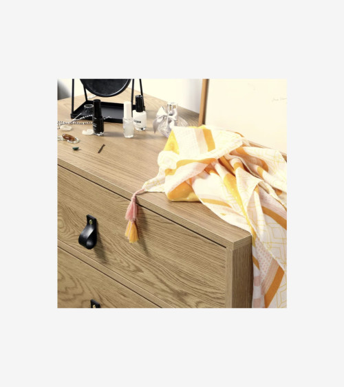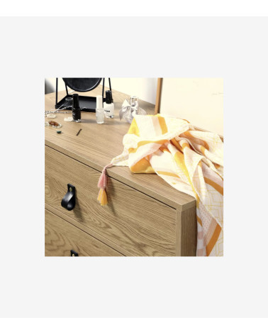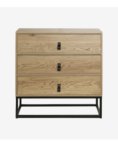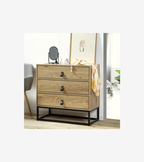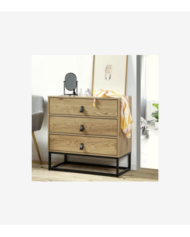 La Commode décor chêne 3 tiroirs piétement métal noir offre un rangement utile et moderne avec un style industriel indémodable.
