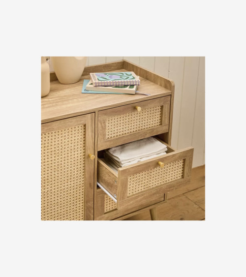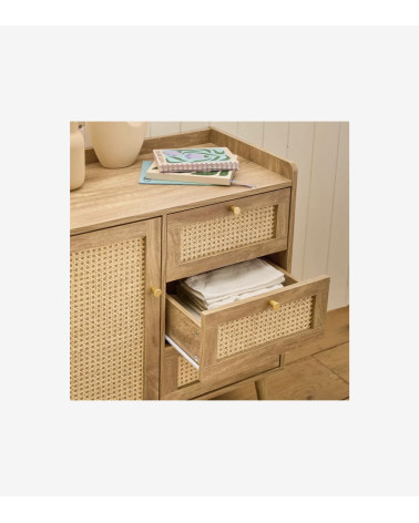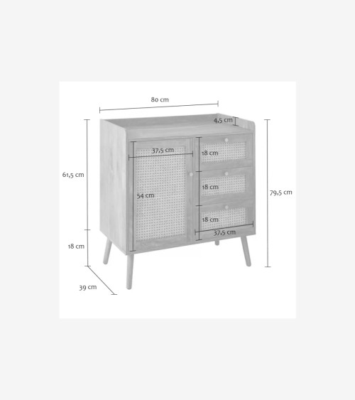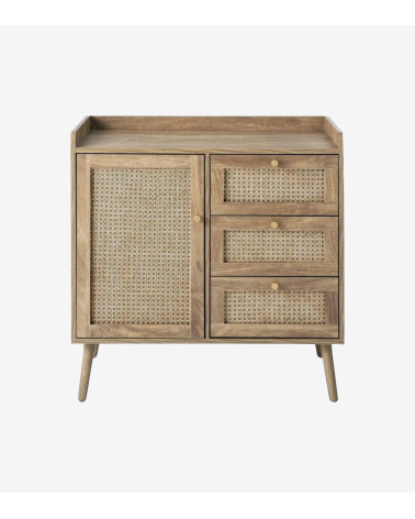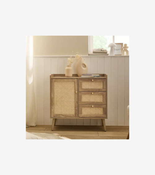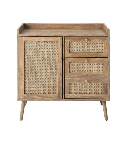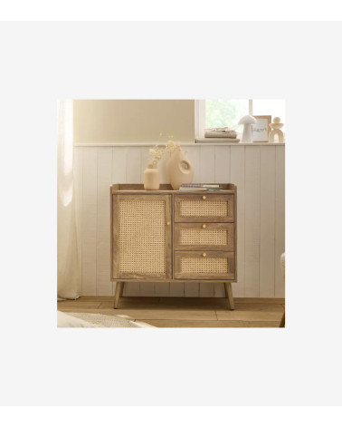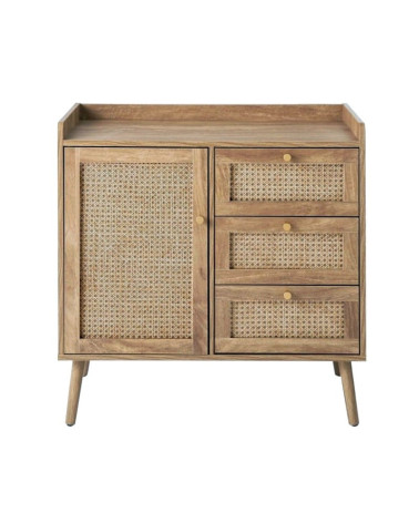 Commode 1 porte 3 tiroirs avec façades en rotin et pieds en bois L 80 cm x P 39 cm x H 79,5 cm