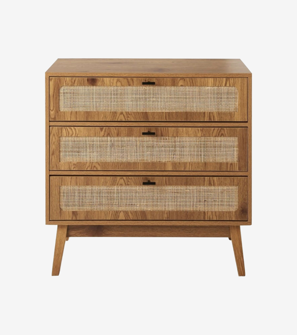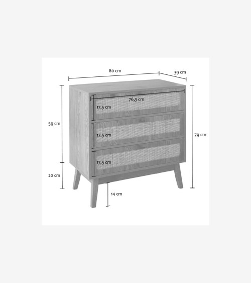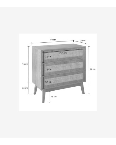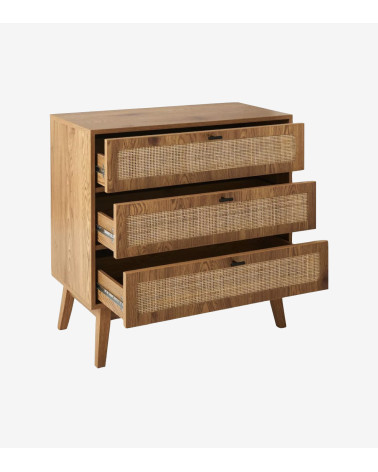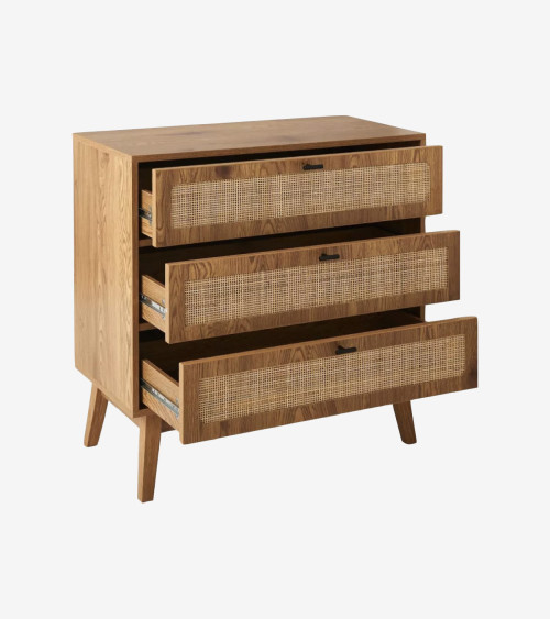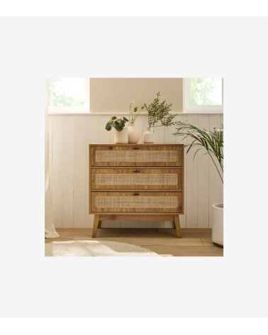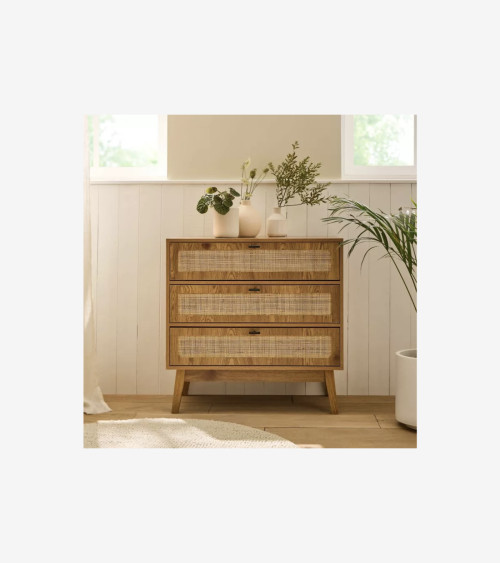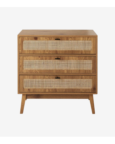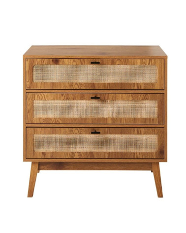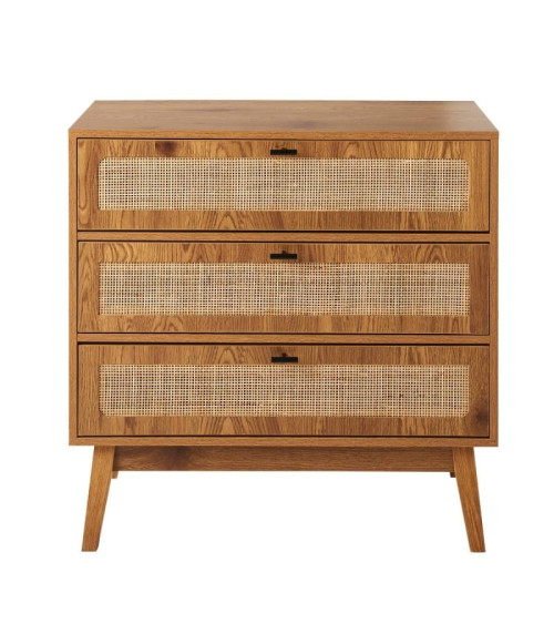 Commode 3 tiroirs avec façades en rotin et pieds en bois L 80 cm x P 39 cm x H 79 cm