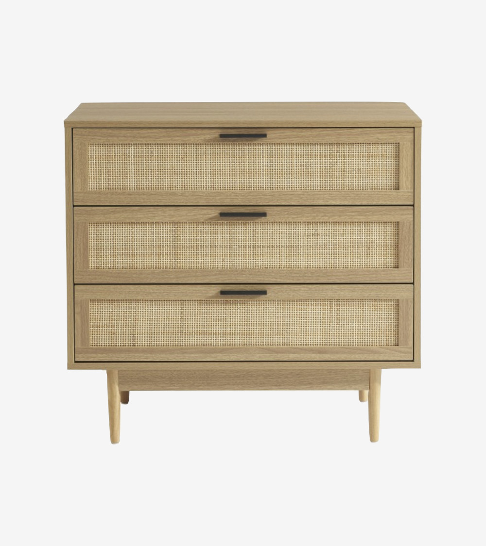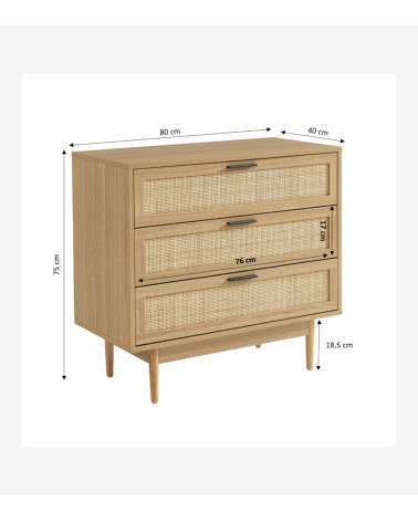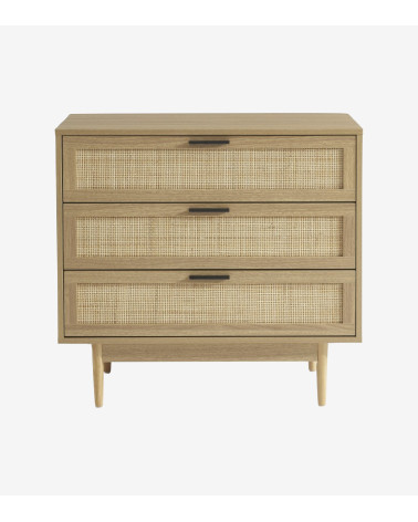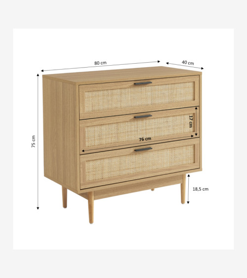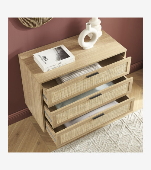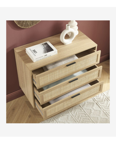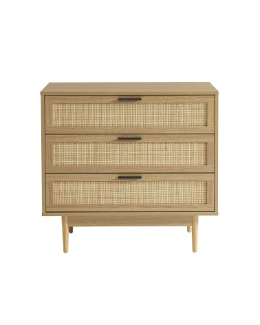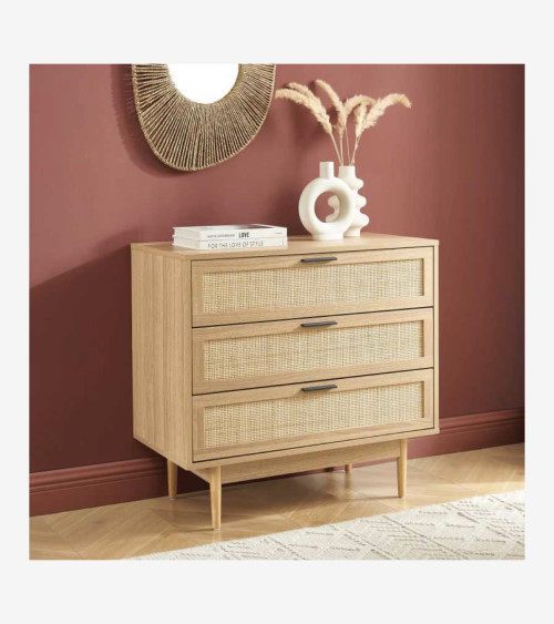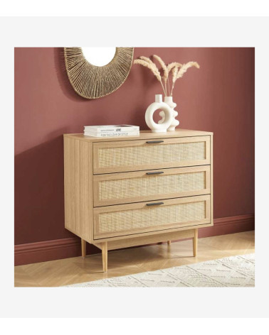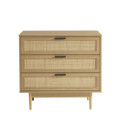 Commode 3 tiroirs effet chêne et cannage rotin L80 x P40 x H75 cm