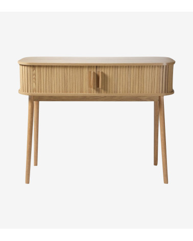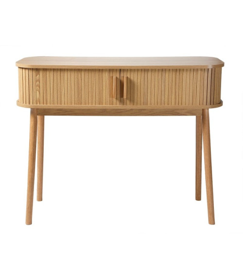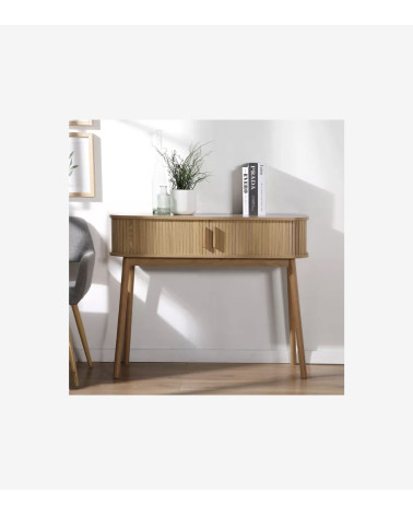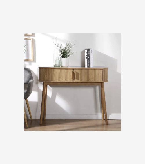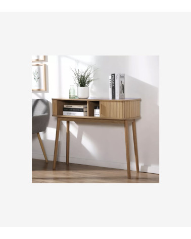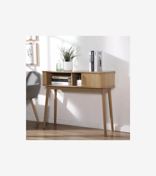 Vous souhaitez aménager votre entrée, couloir ou salon ? Cette console effet bois de chêne, apporte une touche moderne et accueillante à votre maison.Avec son effet bois rainuré sur les portes et ses rangements, ce meuble allie modernité et fonctionnalité. Idéal dans une entrée pour déposer clés, courrier et décoration, il s’adapte aussi dans un salon ou couloir.