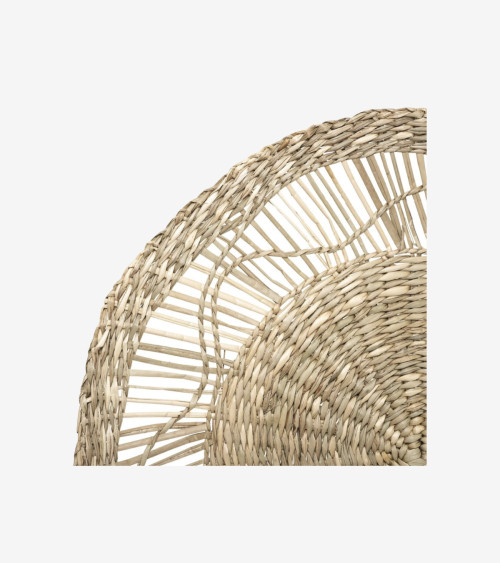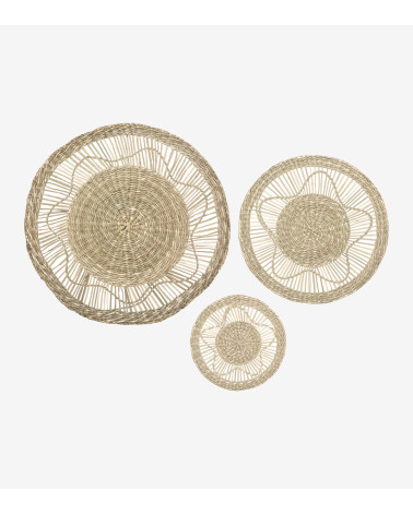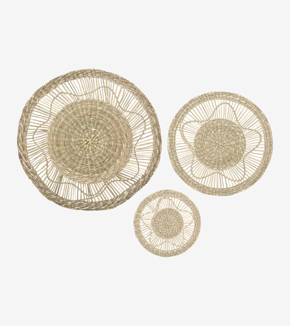 Cette déco murale a été conçue en roseau ce qui lui confère beaucoup de caractère. Au nombre de 3, ces décorations murales présentent des diamètres différents de 18 cm, 28 cm et 38 cm. Disposez-les harmonieusement en quinconce, les unes au dessus des autres ou en enfilade horizontale. À vous de voir selon vos goûts.