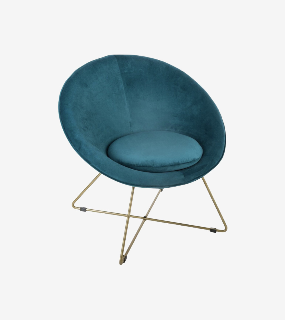 Découvrez ce fauteuil rétro et confortable pour votre salon, chambre, ou votre bureau mêlant des formes rondes et rétro avec des pieds fins en fer pour une élégance remarquable. Son rembourrage en velours offre une assise propice à la détente, tandis que sa structure en fer assure solidité et durabilité.