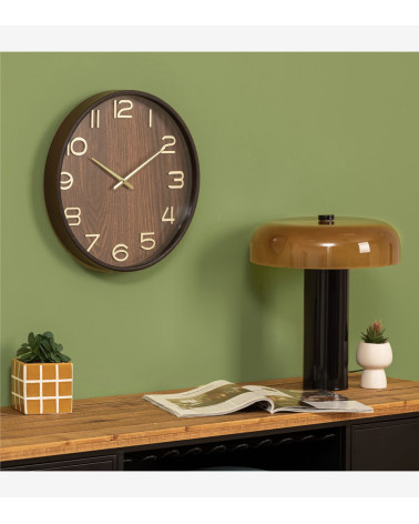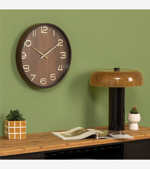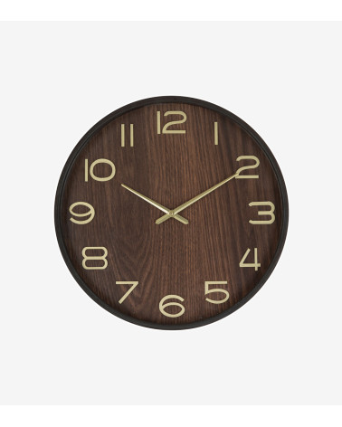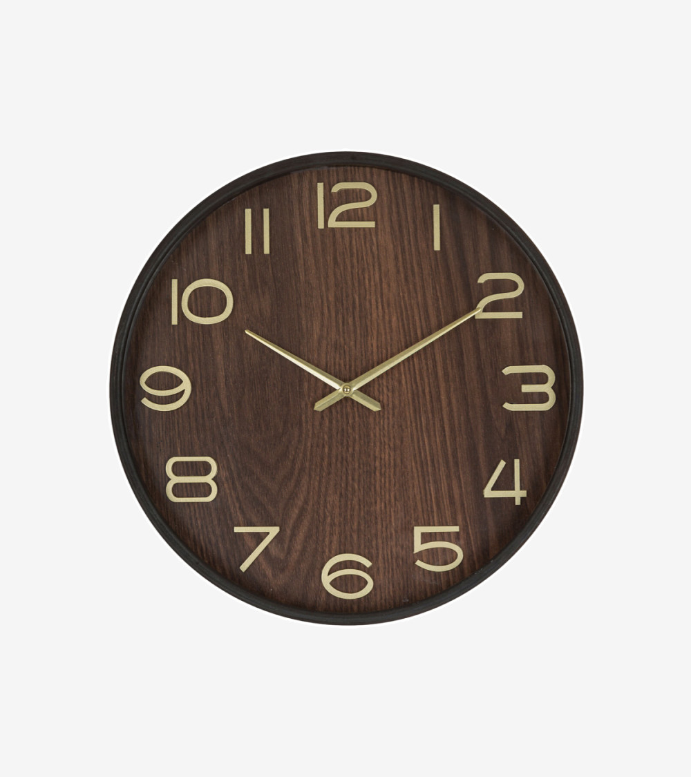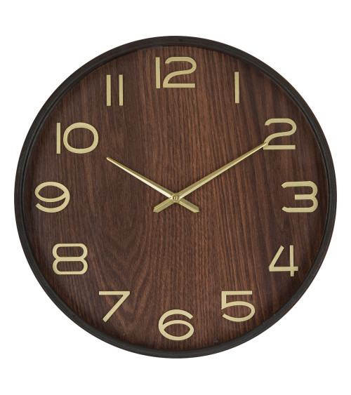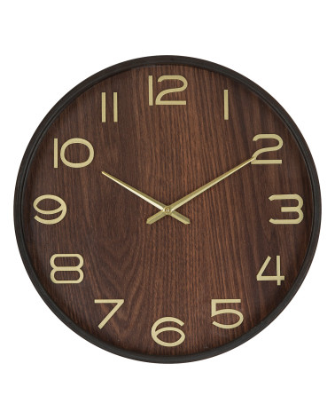 L'horloge est en bois avec une couleur naturelle et intense. Les aiguilles et les chiffres dorés en volume 3D contrastent joliment pour une bonne lisibilité. Cette horloge murale trouvera sa place dans un salon, une cuisine ou une entrée.