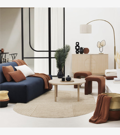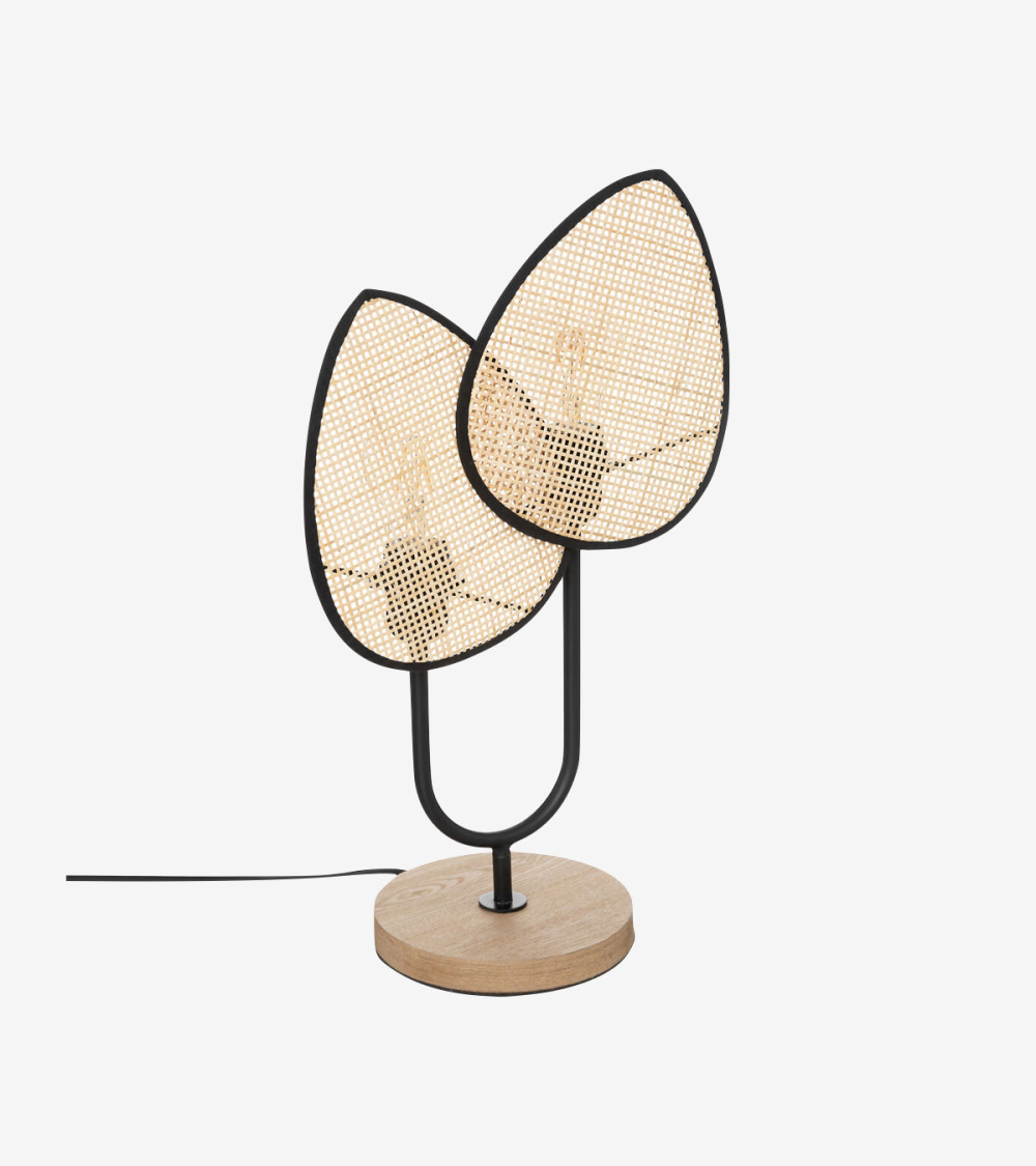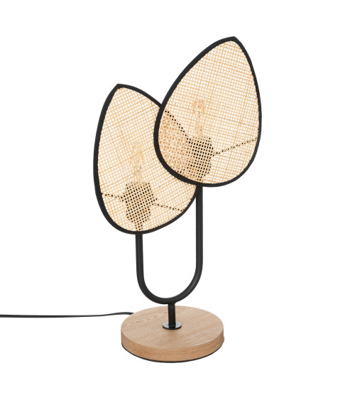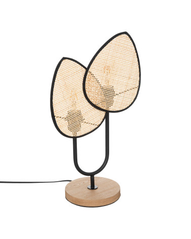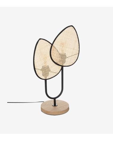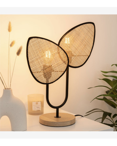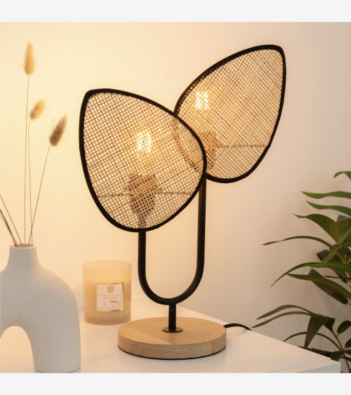 Elle se distingue par sa structure en métal foncé et ses deux panneaux en cannage de rotin qui diffuseront la lumière de deux ampoules avec une touche chaleureuse. Dotée d'un pied cylindrique en bois, elle se mariera volontiers avec du mobilier d'inspiration scandinave.