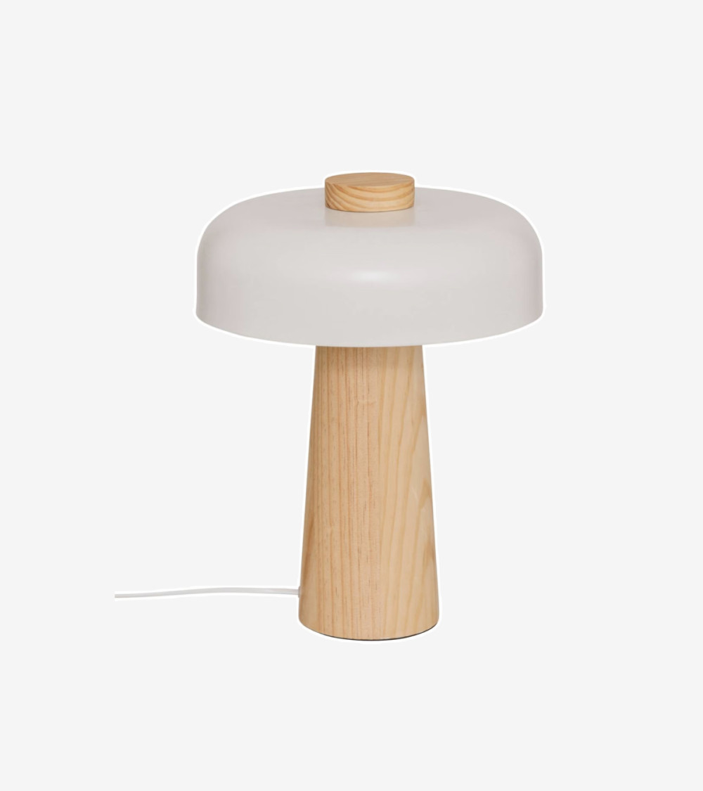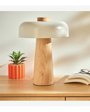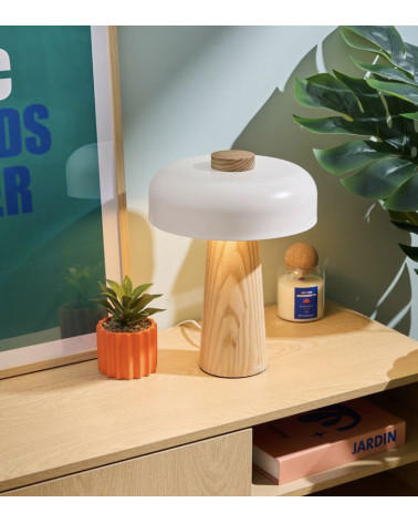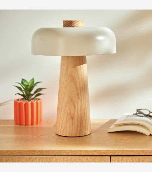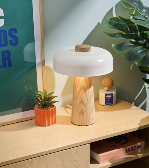 Graphique et fonctionnelle, cette lampe est composée d'un pied conique en bois d'hévéa naturel certifié FSC®*, sur lequel est encastré un abat-jour en acier teinté aux lignes arrondies.