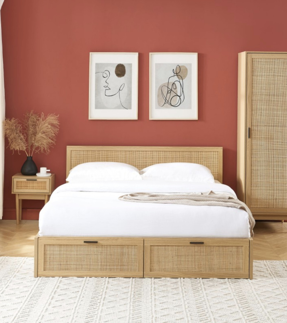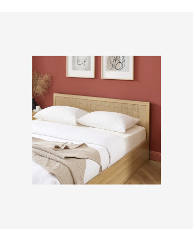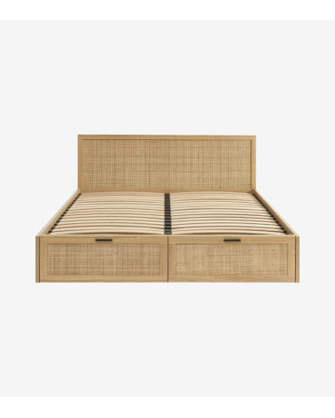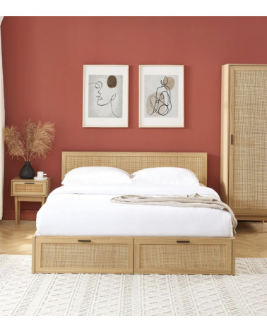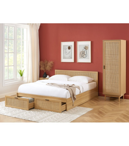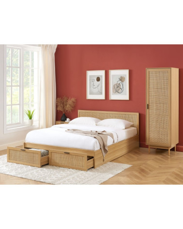 Ce lit à tiroirs arbore un design bohème et intemporel, qui mêle l'effet chêne chaleureux au cannage rotin naturel. Cette combinaison de matières crée une ambiance douce et accueillante dans votre chambre.