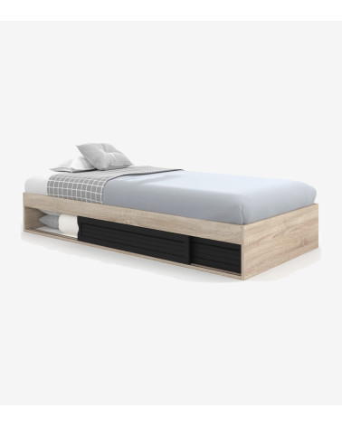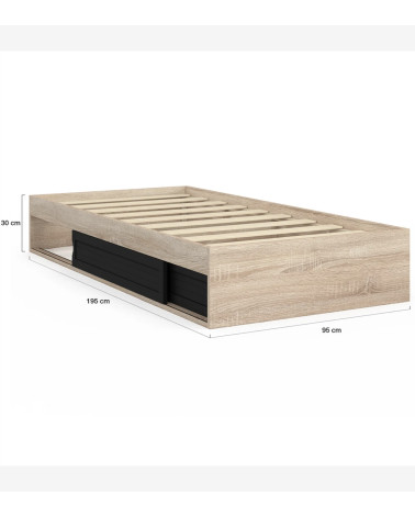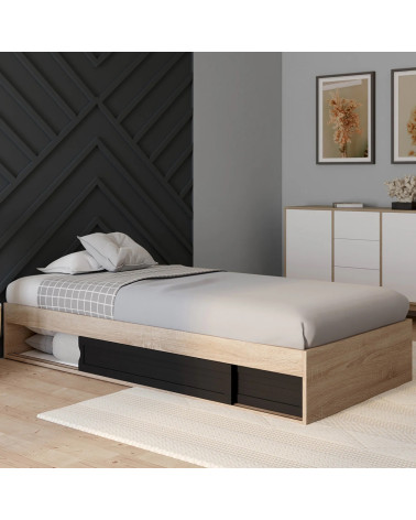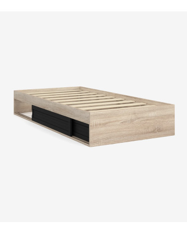 Cadre de lit simple 90x190 cm bois façon hêtre et noir avec rangement et sommier