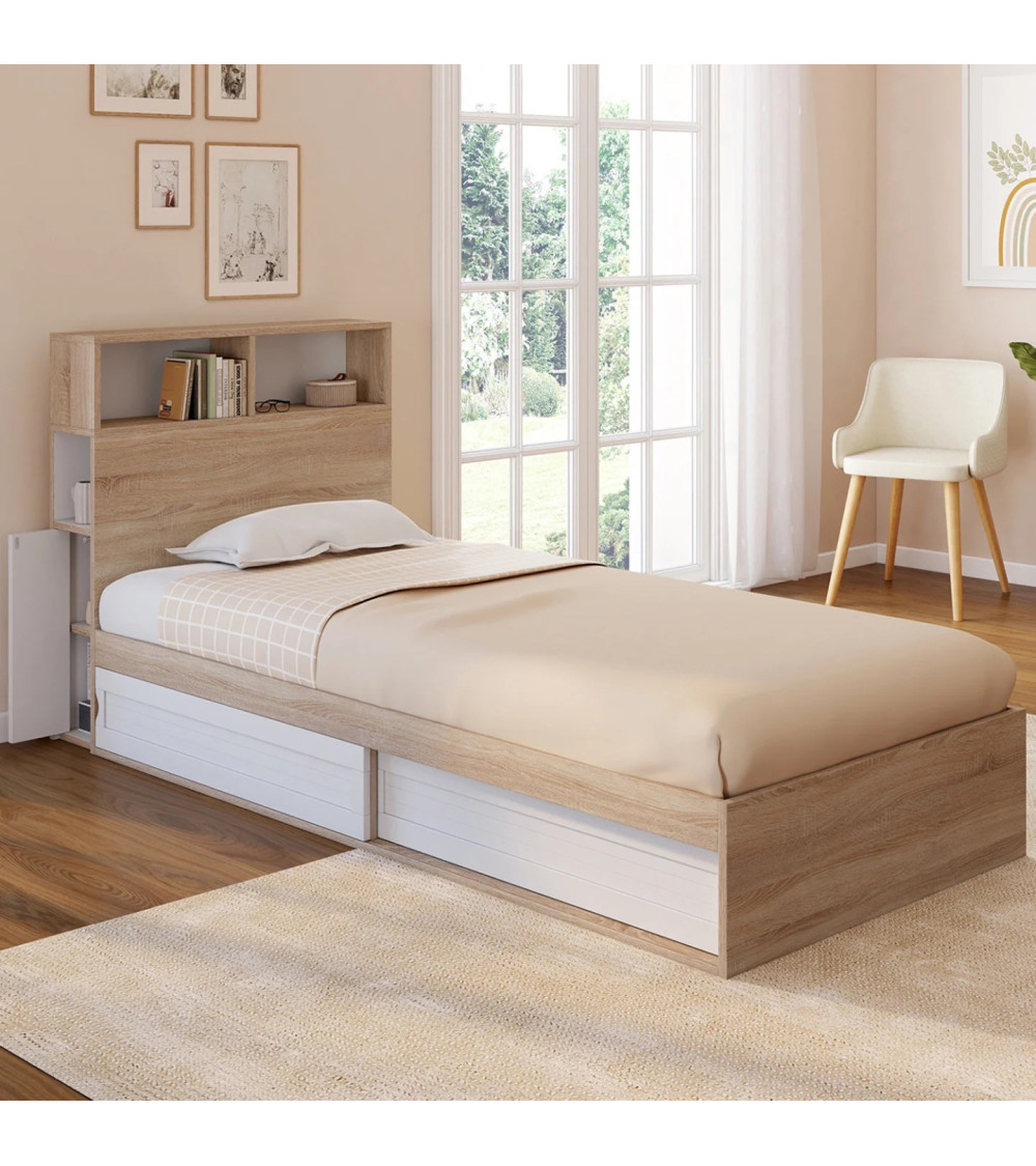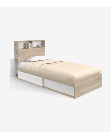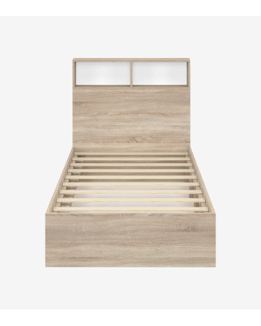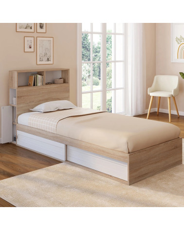 Ajoutez une touche de modernité et de fonctionnalité à votre chambre à coucher avec le lit simple bicolore hêtre et blanc. Ultra fonctionnel, ce lit est composé d'un cadre de lit avec compartiment qui s'ouvre à l'aide de portes coulissantes et d'une tête de lit avec niches frontales et latérales ! Le combo idéal pour parfaire la décoration de votre chambre tout en optimisant l’espace.