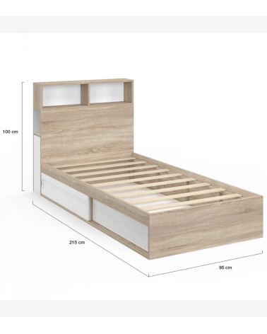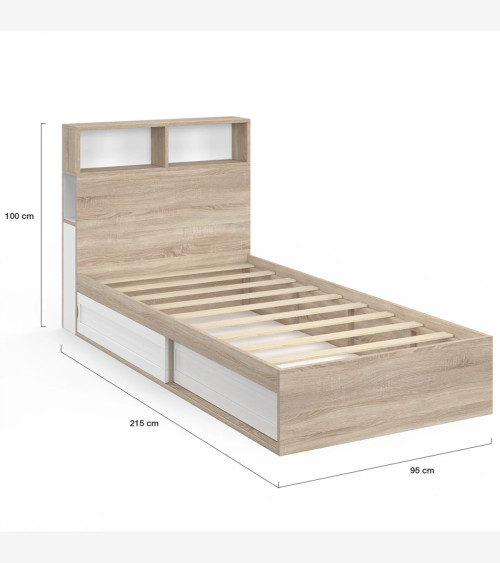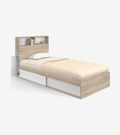 Lit 1 personne sommier 90x190 cm hêtre et blanc avec rangement et tête de lit