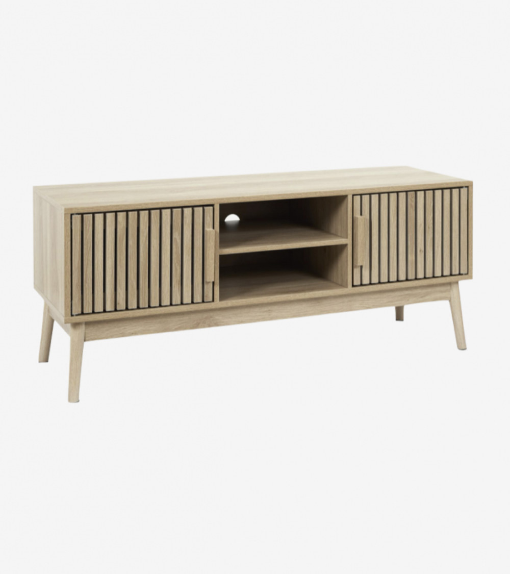 Meuble TV 2 Portes Rayés et 2 Étagères - en Bois L.117 x H.48 x P.40 cm