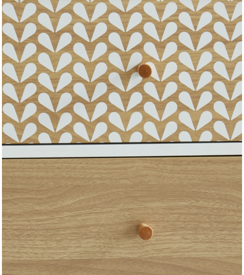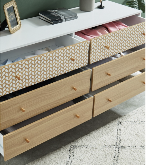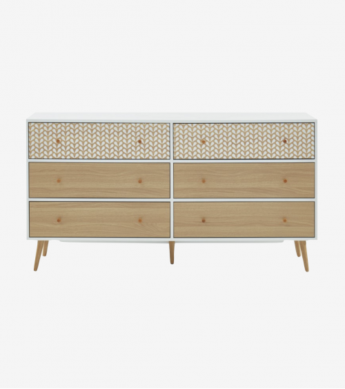 Trouvez votre solution de rangement idéale pour votre chambre à coucher avec cette commode à 6 tiroirs blanc, alliant un design rétro et scandinave avec des motifs délicats et des pieds en bois massif évasés. Avec ses tiroirs à rails coulissants, cette commode offre à la fois style et praticité pour ranger facilement toutes vos affaires.