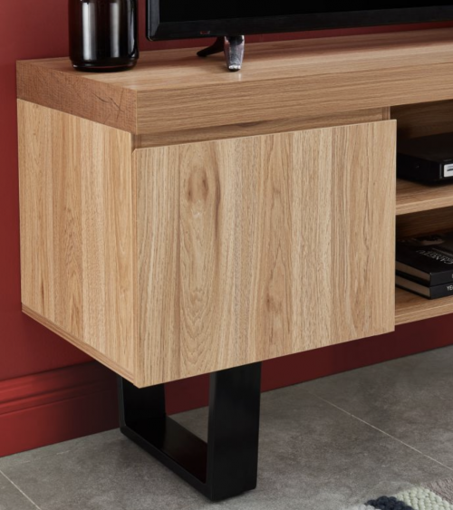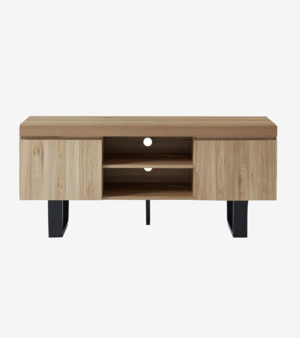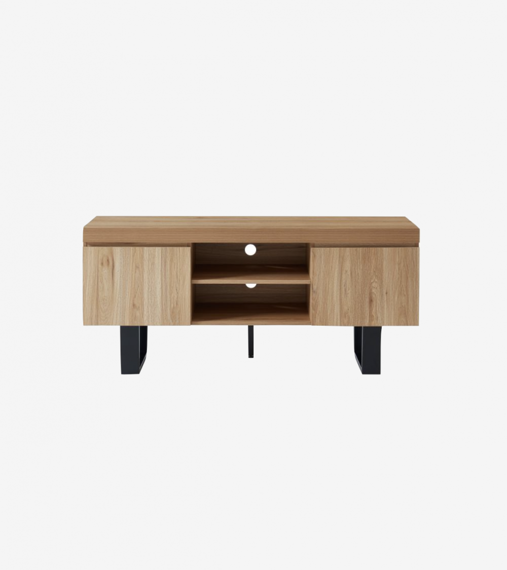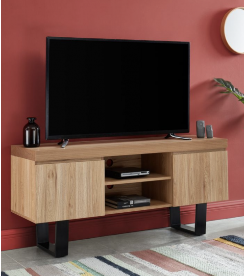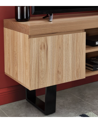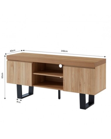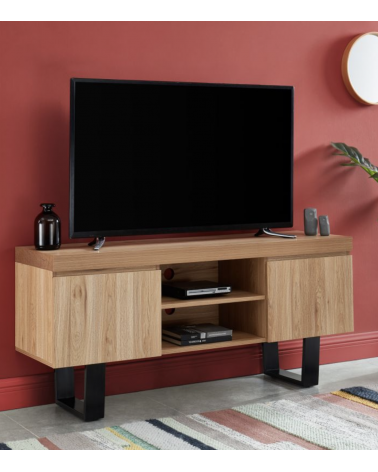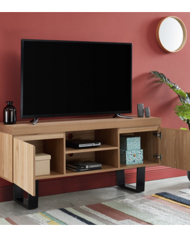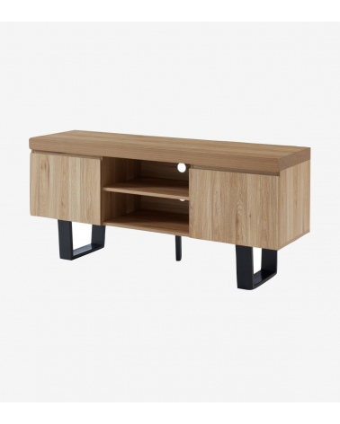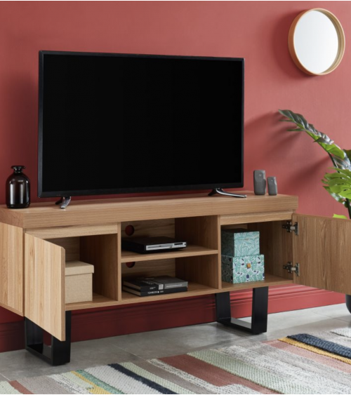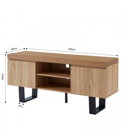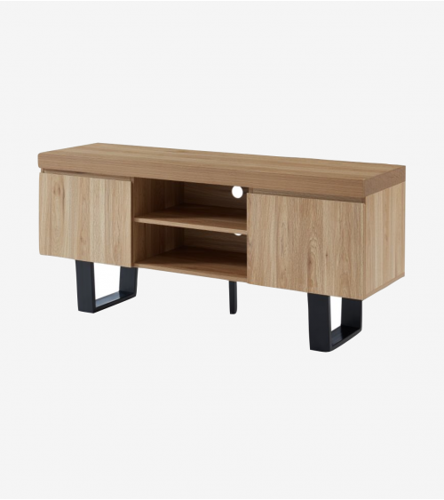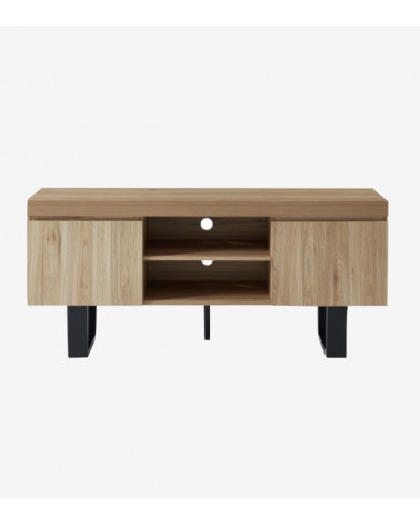 Doté d'un design brut et chaleureux, ce meuble TV au style industriel s'imposera avec élégance dans votre salon. Sa structure en MDF avec un revêtement en mélaminé effet chêne et ses pieds en métal laqué noir arborent un look sophistiqué. Avec ses 2 portes et 2 niches, il offre un espace de rangement suffisant.