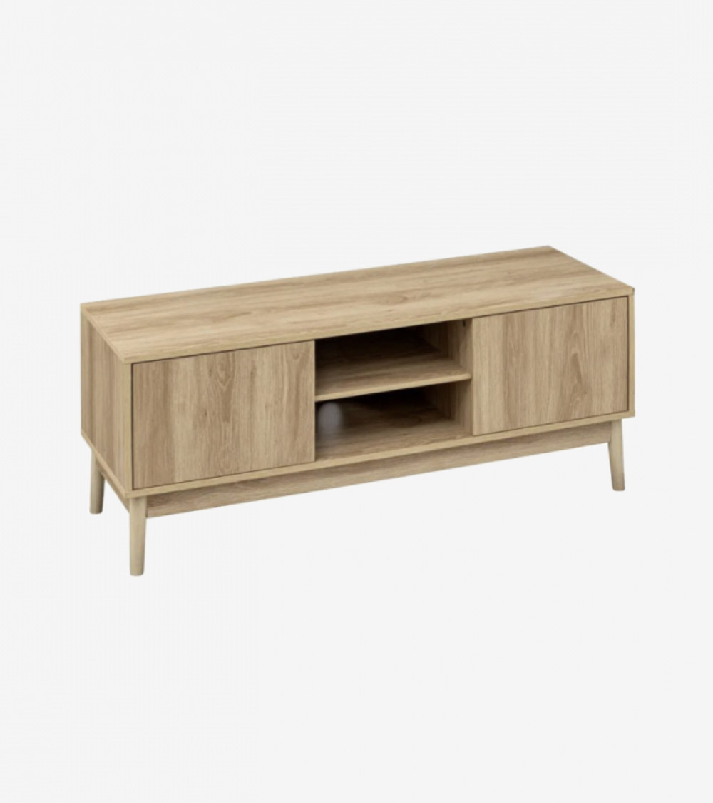 Ce meuble TV en bois, avec ses deux portes et deux niches de rangement dans un coloris beige, apporte une touche moderne et naturelle à votre espace tout en étant robuste.