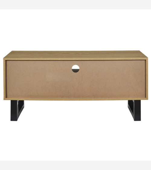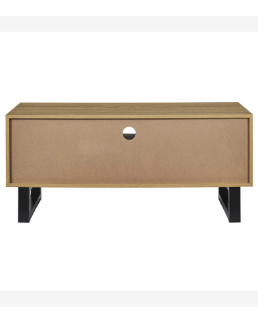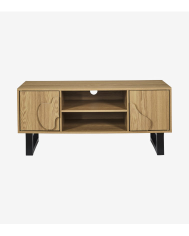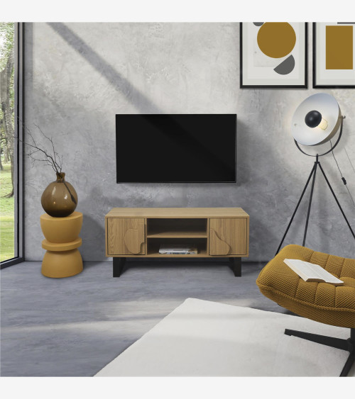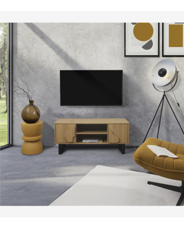 Ce meuble TV allie élégance et fonctionnalité avec sa structure en bois et ses pieds métalliques noirs. Ses portes sculptées et ses espaces ouverts permettent de ranger vos appareils tout en apportant une touche moderne à votre salon. Un meuble design pour un intérieur raffiné.