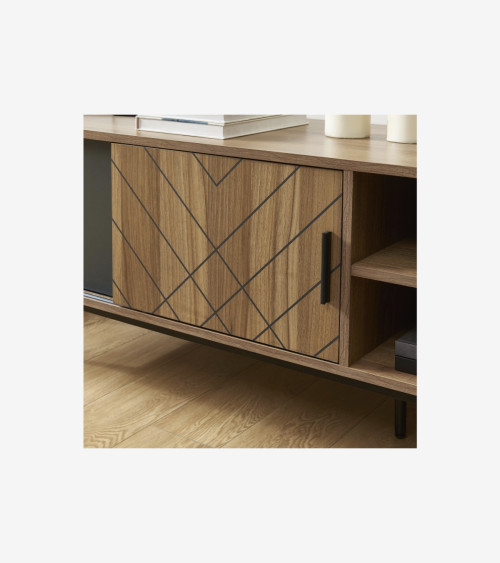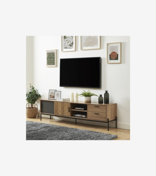 Il se distingue par son design industriel authentique et raffiné, qui combine harmonieusement le revêtement en mélaminé effet chêne foncé et motifs 3D avec les pieds en métal noir. Ce style industriel apportera une touche de caractère et de modernité à votre salon, tout en s'intégrant parfaitement à divers styles d'intérieur.