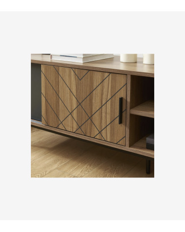 Ce meuble TV dispose de deux portes coulissantes, de deux niches et de deux tiroirs, offrant un espace de rangement modulable pour vos appareils, vos accessoires et vos objets décoratifs. Les portes coulissantes permettent d'accéder facilement à vos appareils audio-vidéo, tandis que les niches et les tiroirs offrent un espace de rangement supplémentaire pour vos accessoires et vos objets décoratifs.
