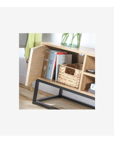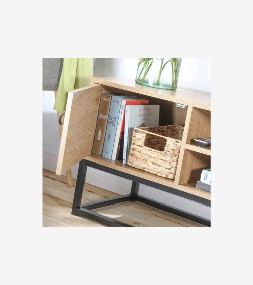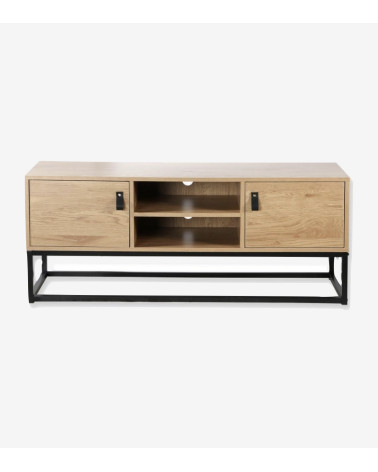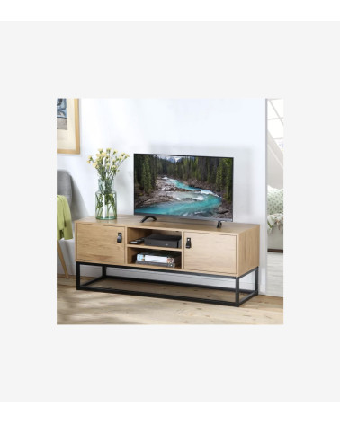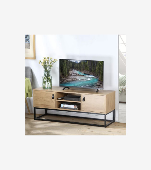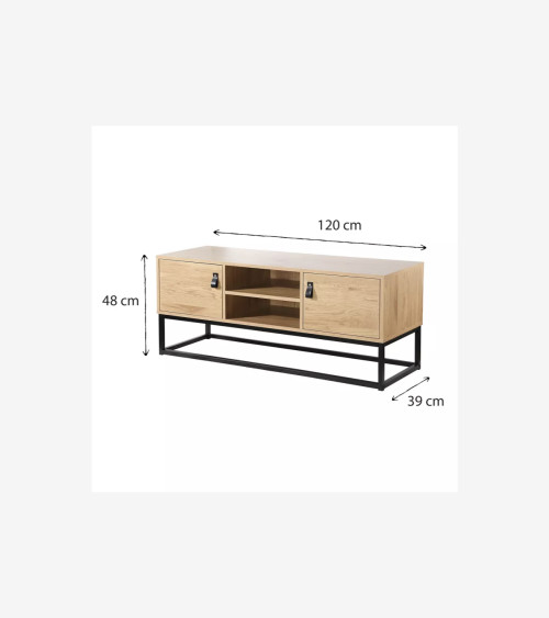 Ce meuble TV 2 portes en bois et piétement métal noir, apportera un style industriel indémodable à votre salon en plus d'être fonctionnel ! Meuble TV industriel mélangeant le métal noir avec un aspect bois avec veinage !