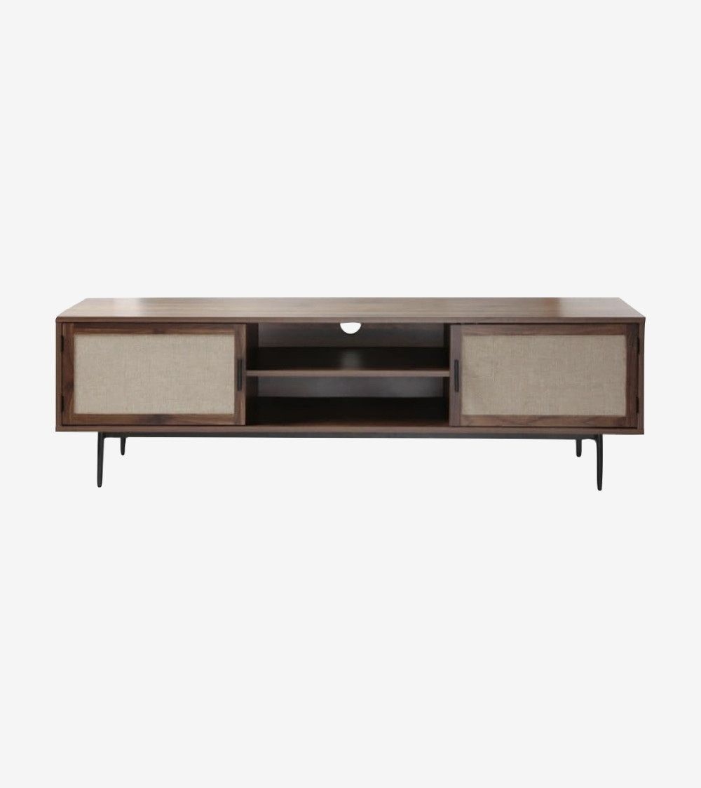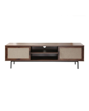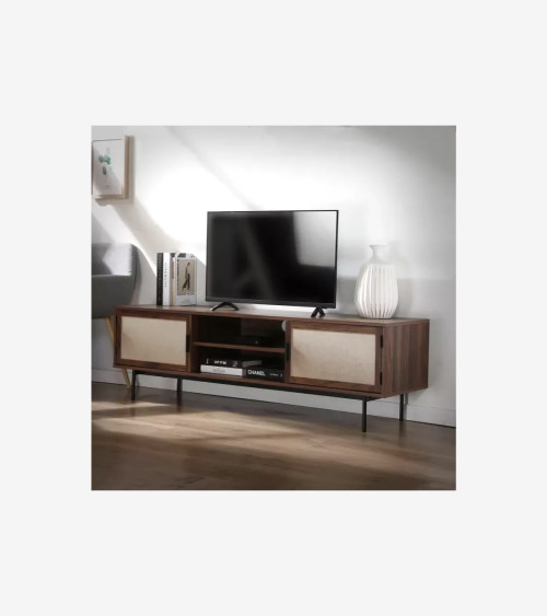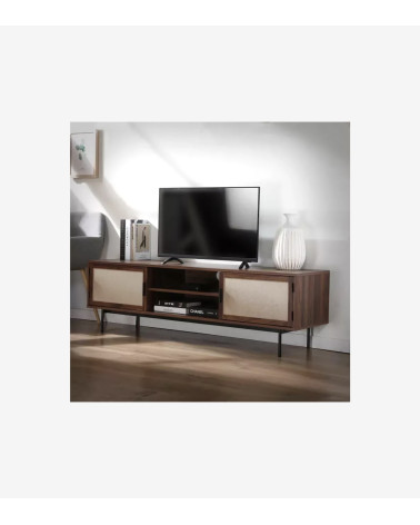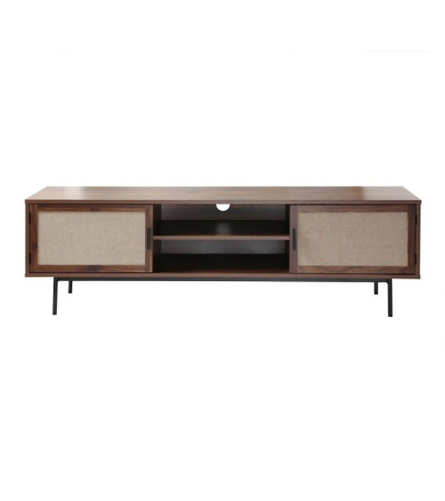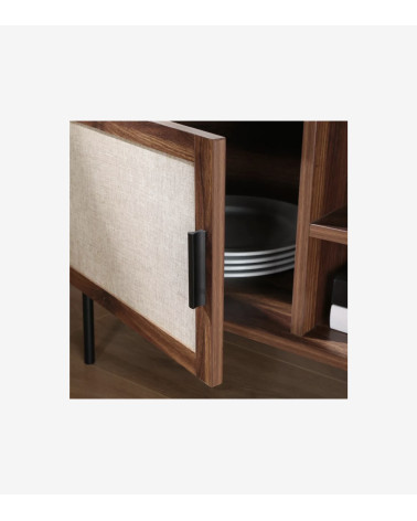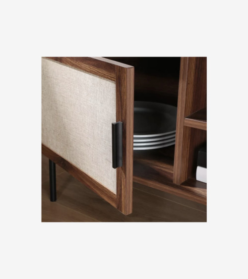 Apportez une touche sophistiquée à votre salon avec ce meuble TV au design raffiné. Son décor noyer chaleureux, associé à des détails en métal noir et à des portes à cadre avec panneau en tissu beige, crée un contraste élégant et tendance.