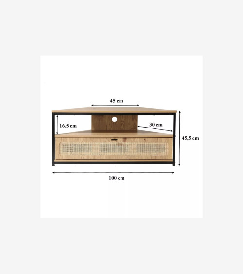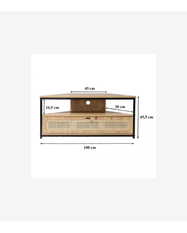 Le meuble TV d'angle est conçu pour optimiser l'espace de votre salon. Avec une longueur de 100 cm, une profondeur de 30 cm et une hauteur de 45 cm, il s'intègre parfaitement dans les coins de votre pièce. Ce meuble est doté d'une porte rabattable avec un cannage en rotin naturel, offrant un espace de rangement pratique et esthétique.