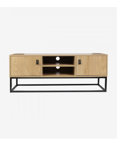 Ce meuble TV en bois et métal noir à deux placard et tiroirs est parfait pour ranger vos magazines, télécommandes et autres objets du quotidien. Sa structure en bois brut et son piétement en métal noir ajoutent du caractère à votre intérieur.