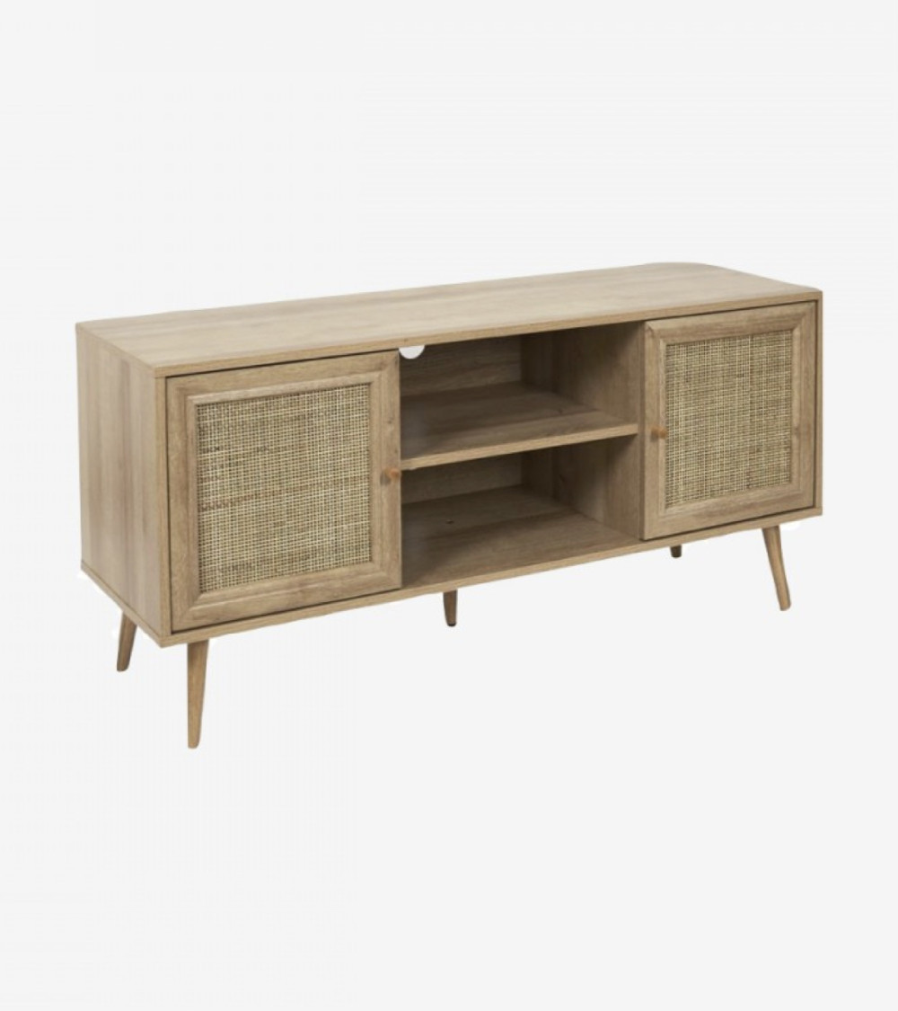 Meuble TV 2 Portes en Rotin et 2 Étagères en Bois