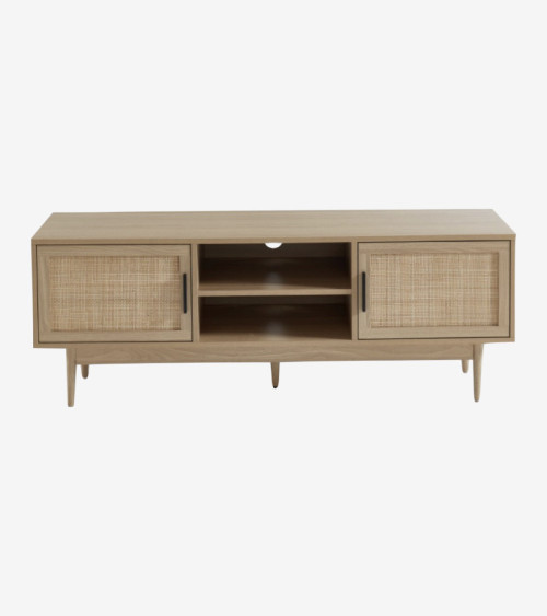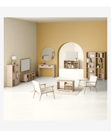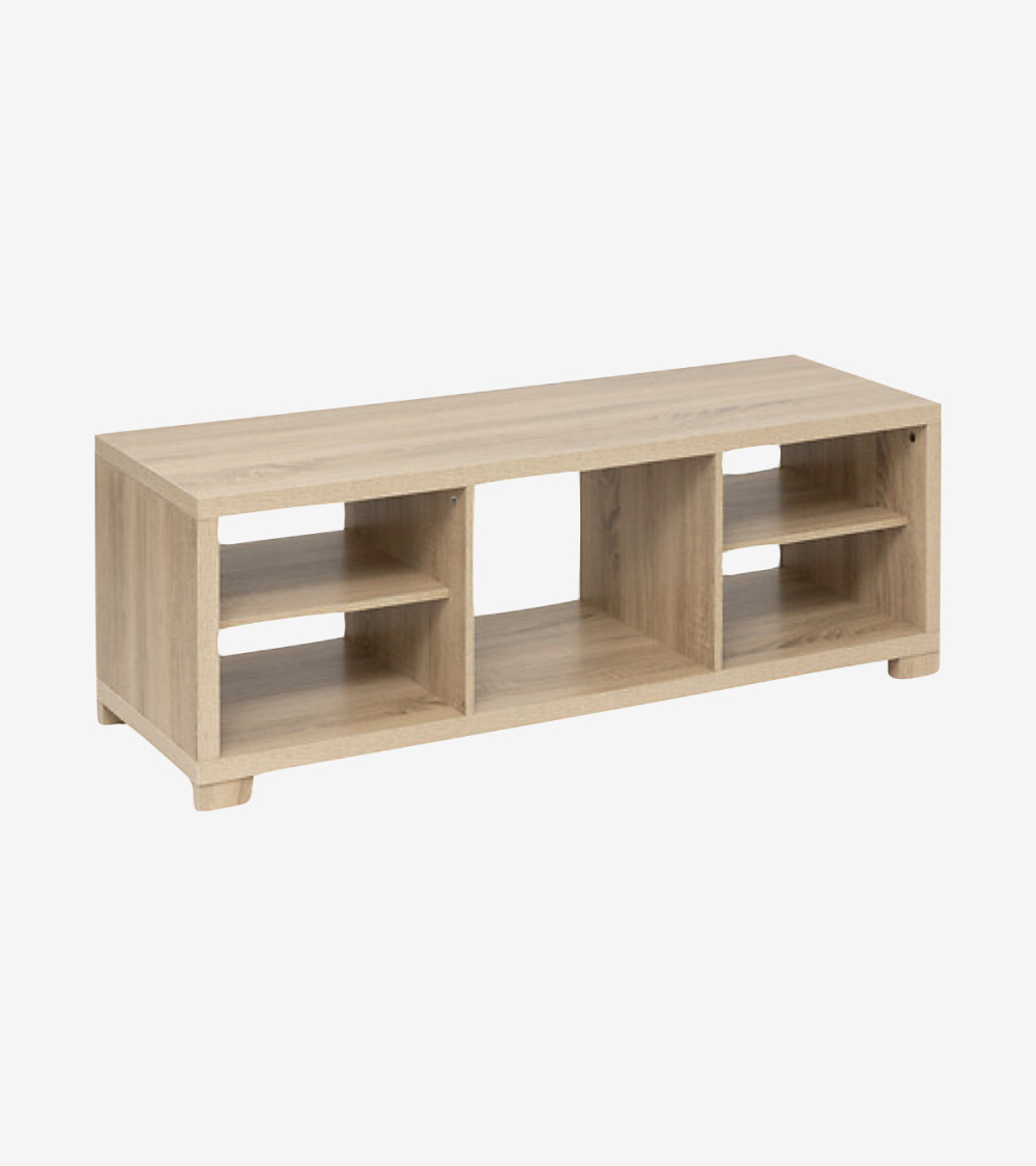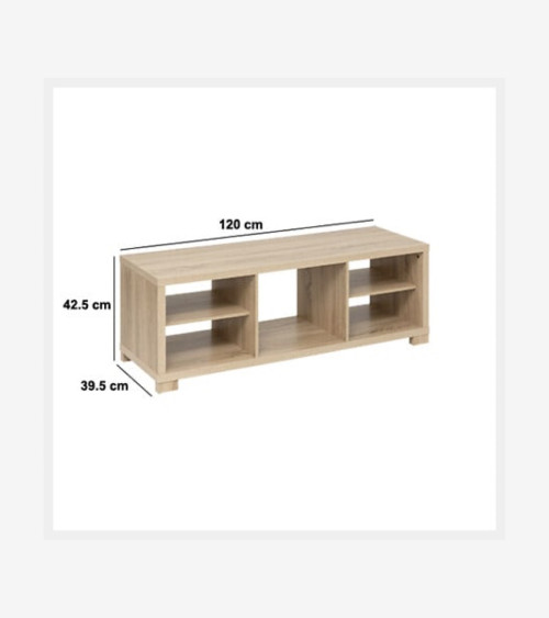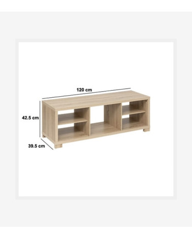 Ce meuble TV complète en toute sobriété l'aménagement de votre salon. Il présente une forme rectangulaire et des lignes épurées. En plus de ça, le meuble TV en imitation bois apporte une touche chaleureuse supplémentaire à votre intérieur. Ses 5 niches de rangement sous son plateau principal sont idéales pour ranger de nombreux éléments ou mettre en avant vos décorations.