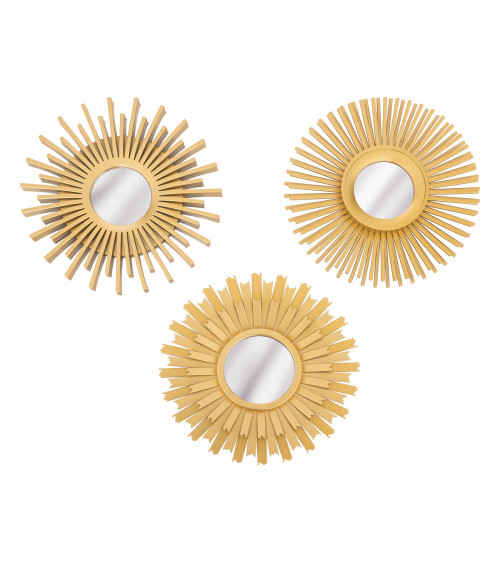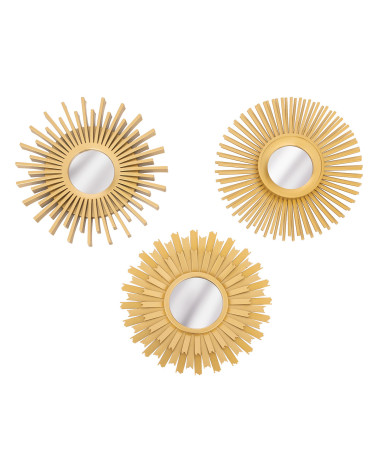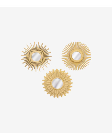 Idéal pour réchauffer une entrée comme une chambre à coucher, le lot est composé de 3 miroirs dont les rayons dorés sont ciselés de différentes manières. Raffinés, ils vous permettront d'ajouter une note précieuse dans la pièce de votre choix, chacun étant doté de son propre système de fixation. Laissez libre cours à vos envies déco !