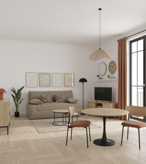 Ce pack de mobilier bohème est idéal pour un premier logement, un investissement locatif ou un aménagement chaleureux et différenciant.
