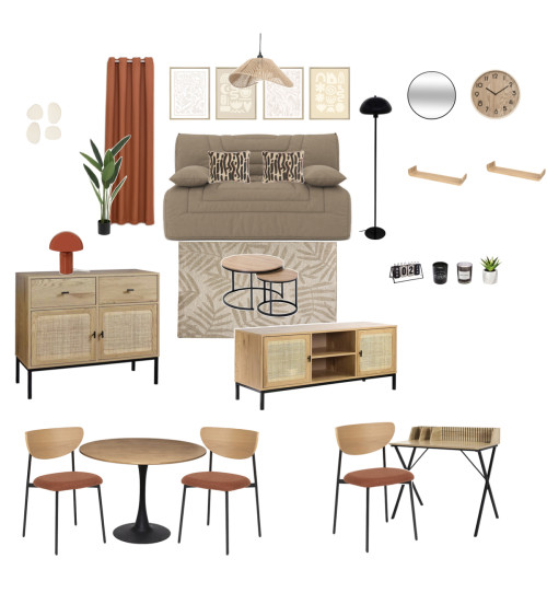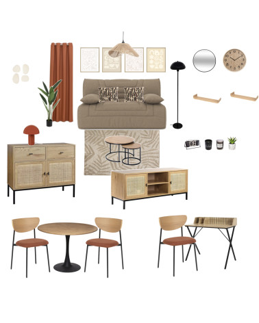 Ce pack de meuble studio bohème a été conçu pour apporter du caractère et de la douceur aux petits espaces. Grâce à ce pack de mobilier complet, vous disposez de tous les éléments essentiels pour aménager un studio harmonieux, fonctionnel et agréable à vivre, sans multiplier les achats ni dépasser votre budget.