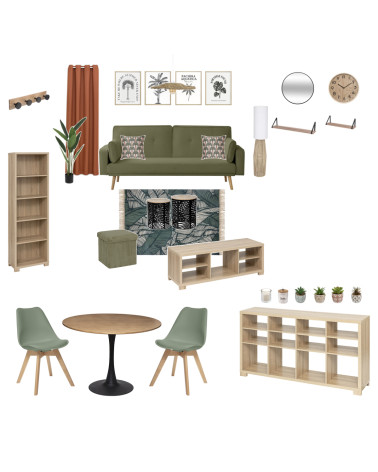 Ce pack de meuble T2 Jungle a été conçu pour aménager un appartement deux pièces en créant une atmosphère naturelle et chaleureuse. Grâce à ce pack de mobilier complet, vous disposez de tous les éléments essentiels pour équiper un séjour et une chambre de manière cohérente, sans multiplier les achats ni dépasser votre budget.