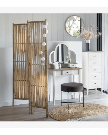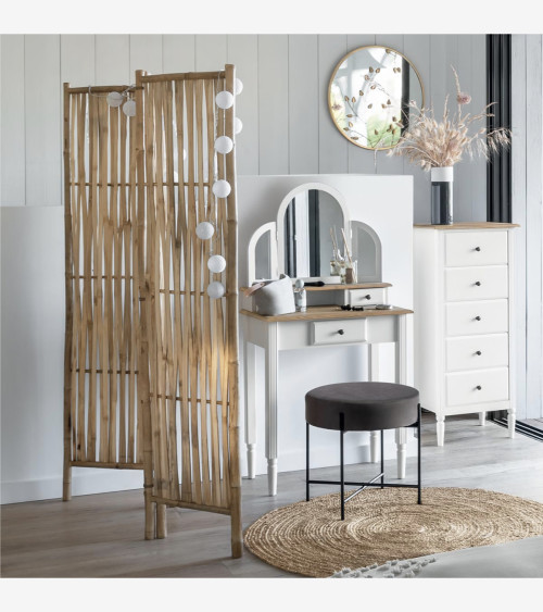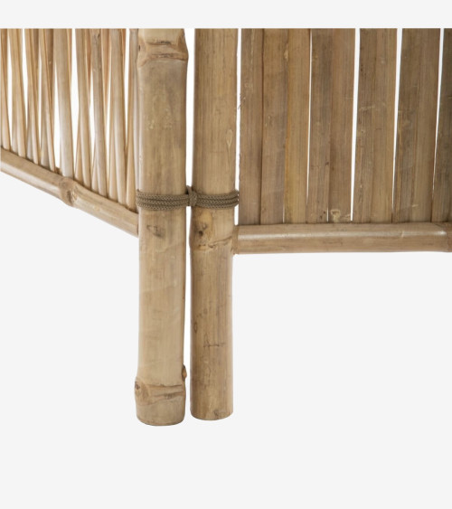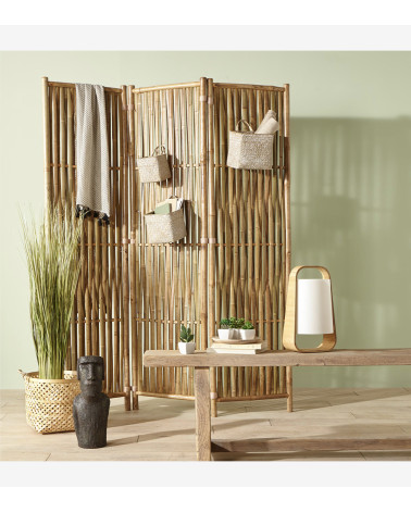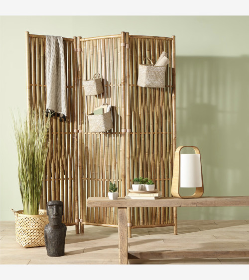 Composé de 3 panneaux en bambou naturel tressé articulés par des liens discrets, cet élégant paravent au style bohème trouvera aisément sa place dans une chambre ou une entrée.