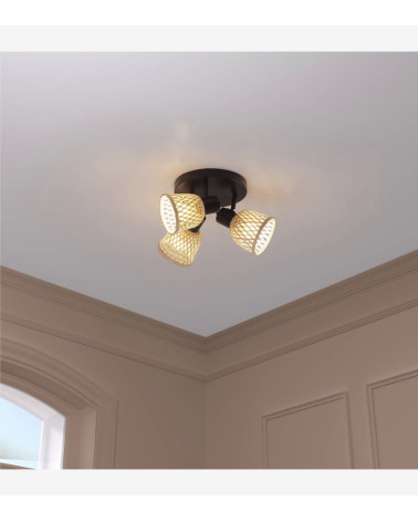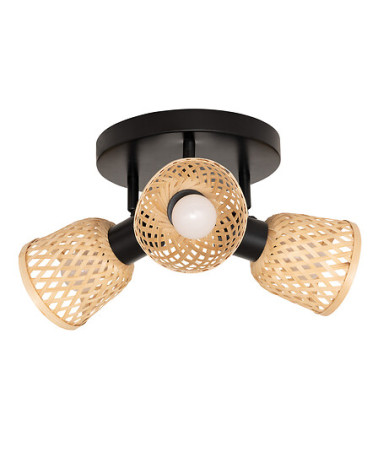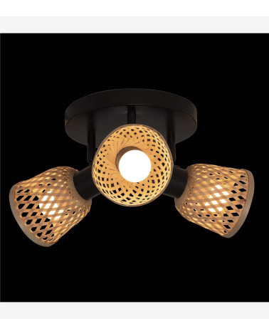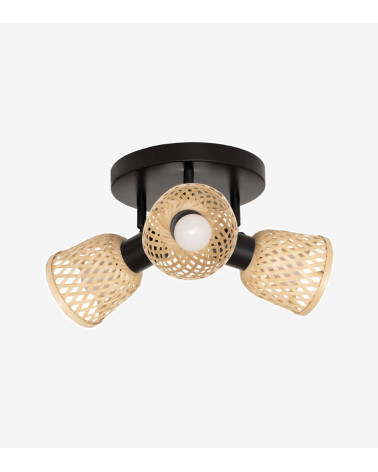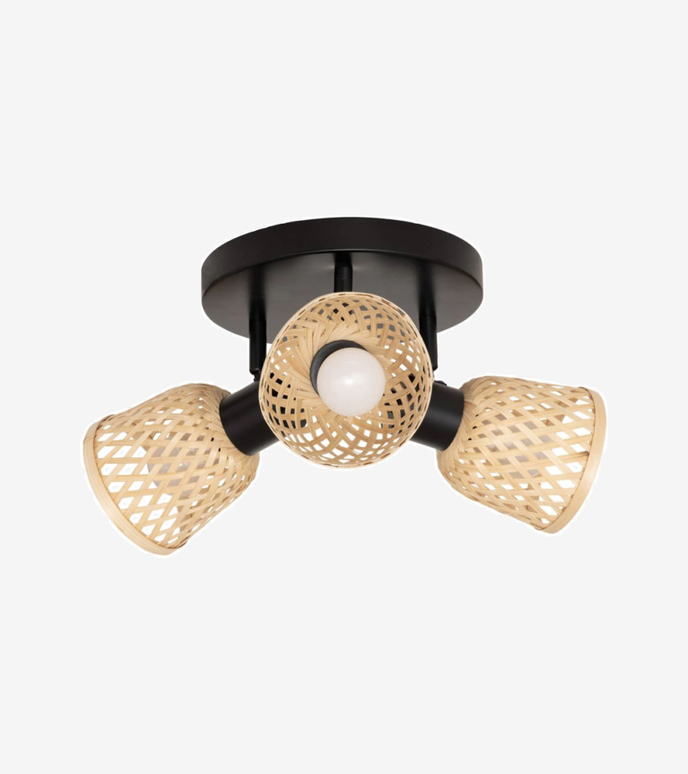 Le plafonnier bois a est composé d'une base en acier à fixer au plafond sur laquelle s'articulent 3 spots à abat-jours en bambou naturel tressé et certifié FSC®*. Le tressage des abat-jours créera des jeux de lumière chaleureux, chaque spot pouvant être orienté en fonction des besoins.