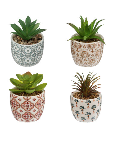 Imitant à la perfection plusieurs variétés de succulentes, cette plante artificielle se distingue par son ravissant pot en céramique. Orné de différents motifs très délicats, ce petit contenant de 9 cm de haut vous permettra d'installer votre plante sur une étagère comme dans une bibliothèque.