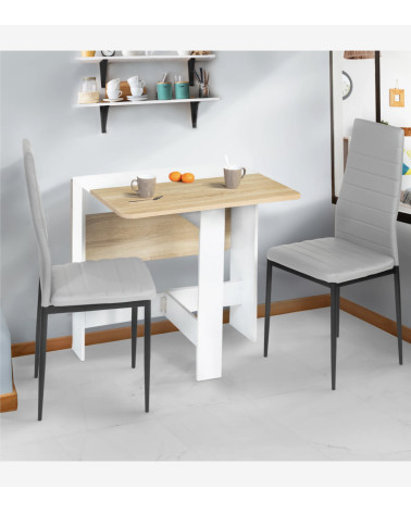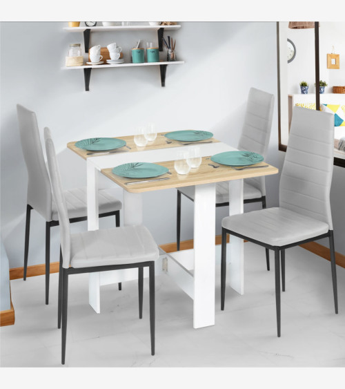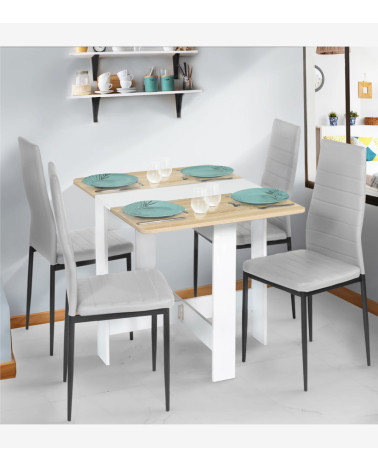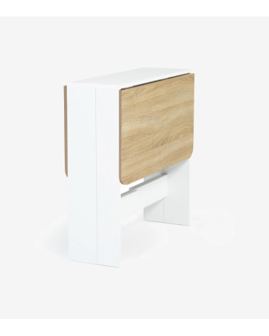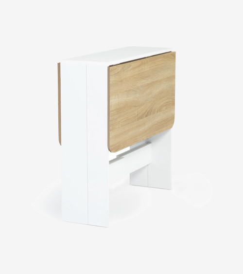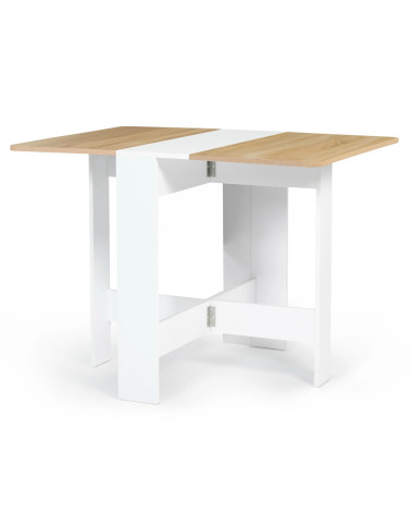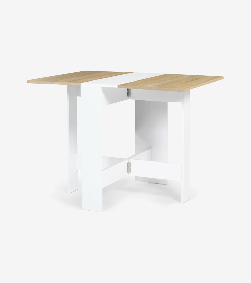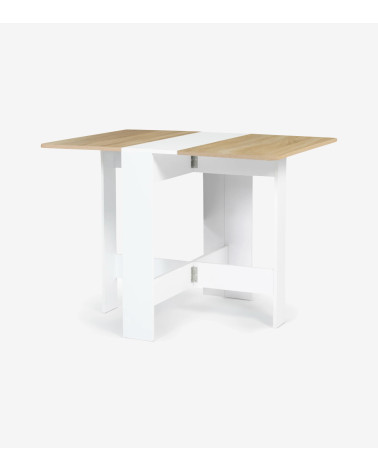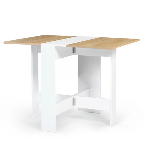 Craquez pour la table pliante aux coloris modernes blanc et façon hêtre! Modulable, constituée d'un plateau central et de 2 plateaux rabattables, transformez-la en un instant! Rectangulaire, elle fait office de table de salle à manger ou de cuisine, de console ou bien de bureau d'appoint. Avec ses lignes simples, elle trouvera facilement sa place au centre de votre cuisine ou le long d'un mur.