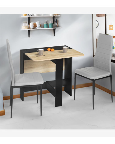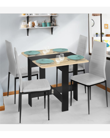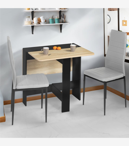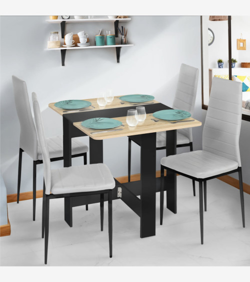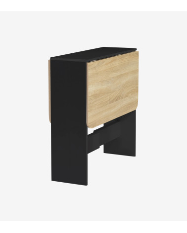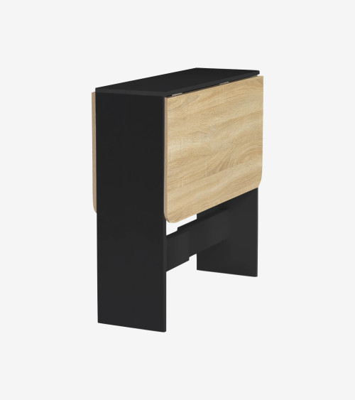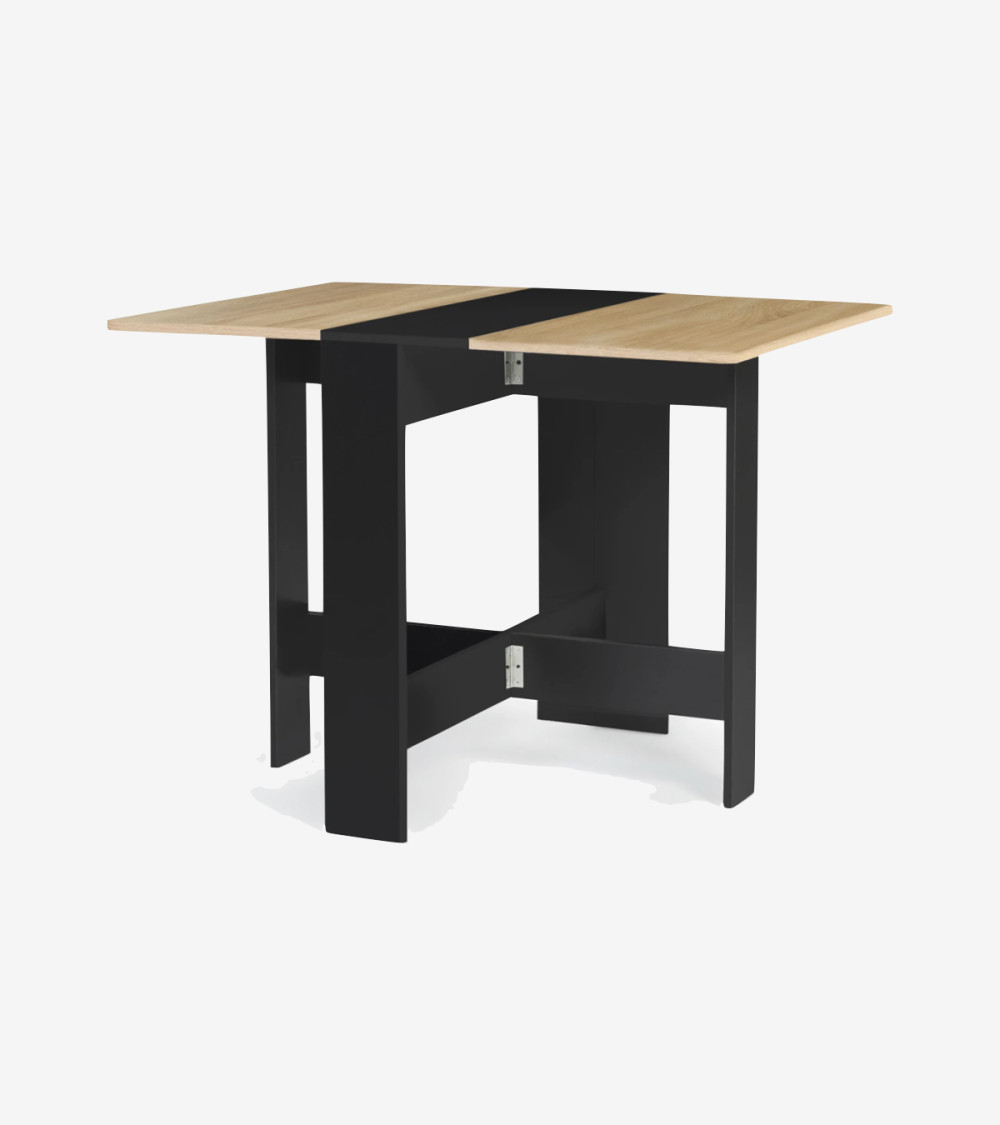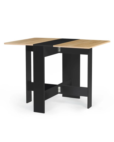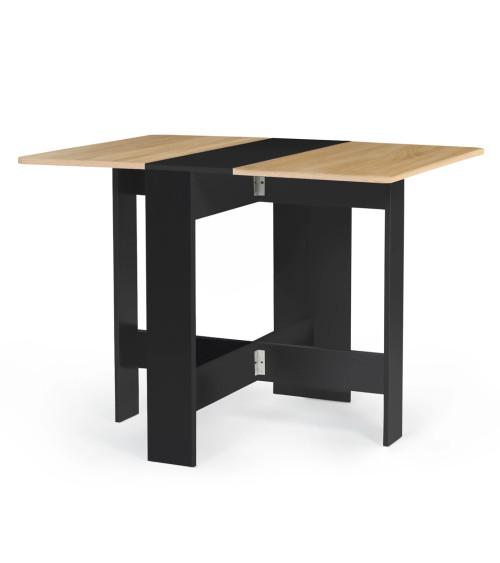 Craquez pour la table pliante aux coloris modernes noir et façon hêtre! Modulable, constituée d'un plateau central et de 2 plateaux rabattables, transformez-la en un instant! Rectangulaire, elle fait office de table de salle à manger ou de cuisine, de console ou bien de bureau d'appoint. Avec ses lignes simples, elle trouvera facilement sa place au centre de votre cuisine ou le long d'un mur.