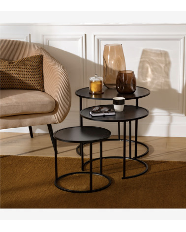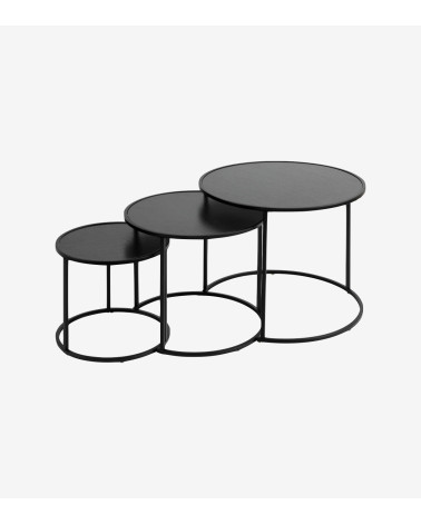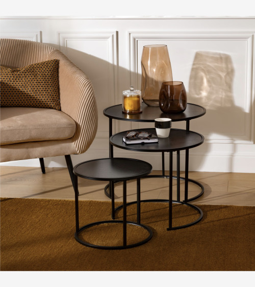 Avec son design en métal, le lot de 3 tables d'appoint décorera harmonieusement une pièce de vie. Le plateau possède un revêtement en mélaminé avec un effet bois. Très pratique, le format gigogne vous permettra d'emboiter les trois tables entièrement afin de gagner de la place dans votre maison.