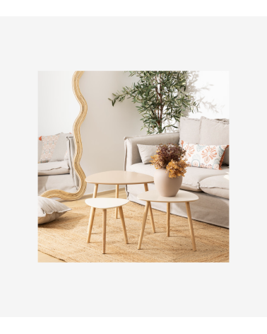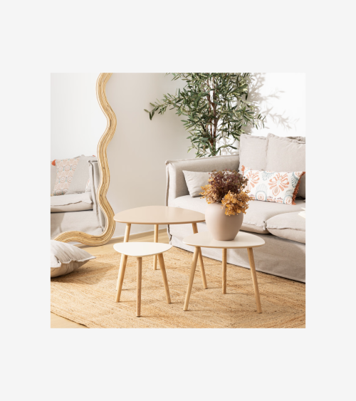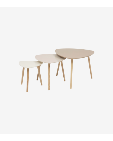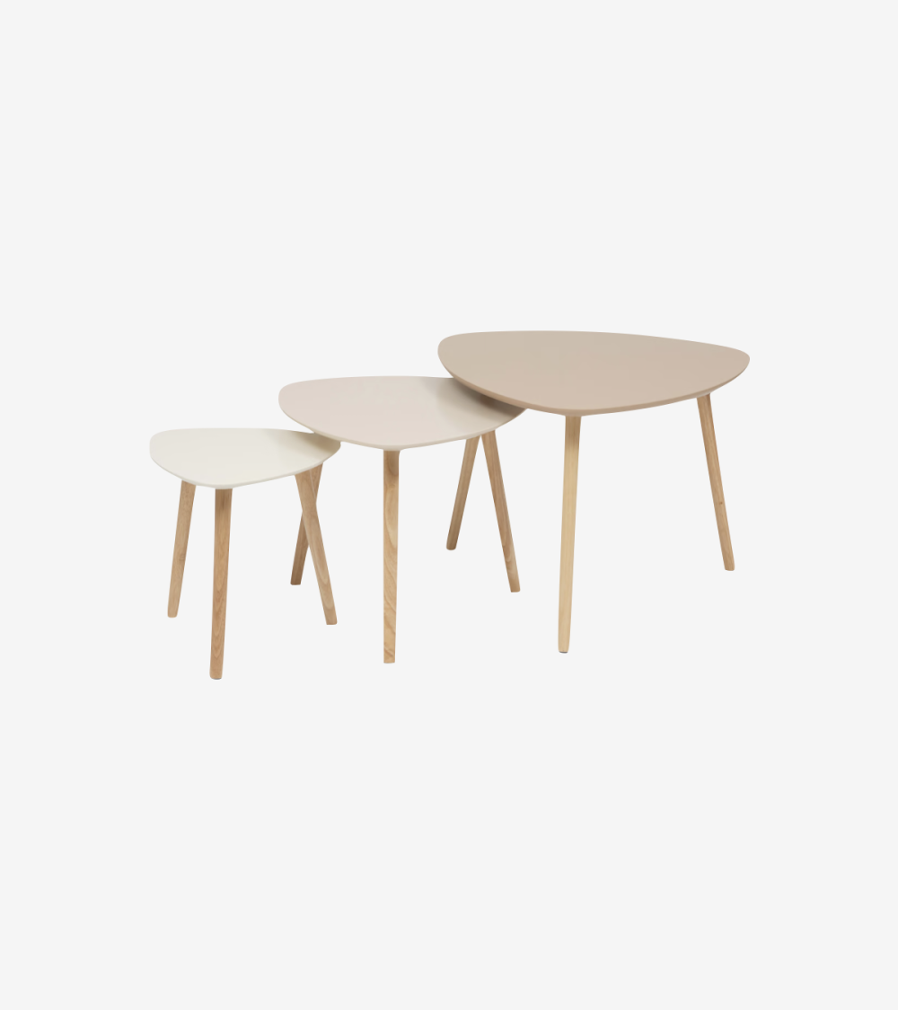 Les 3 tables gigognes séduisent par leur design épuré et leur caractère fonctionnel. Idéales pour les petits espaces, elles s'emboîtent complètement pour vous procurer un gain de place optimal. Leurs plateaux en forme de goutte sont peints dans trois coloris doux et tendance pour former un ensemble chaleureux, rehaussé par des pieds tubulaires en bois massif certifié FSC.