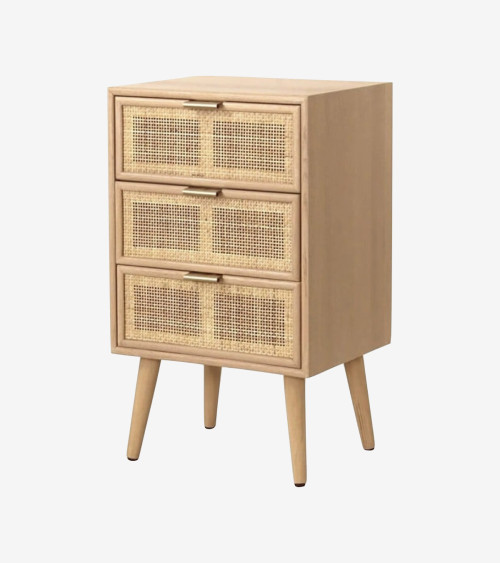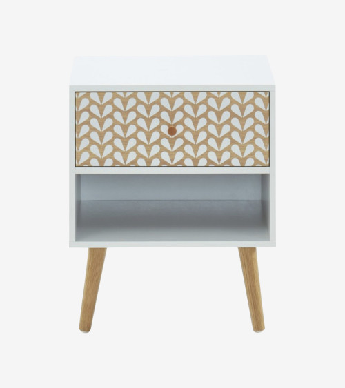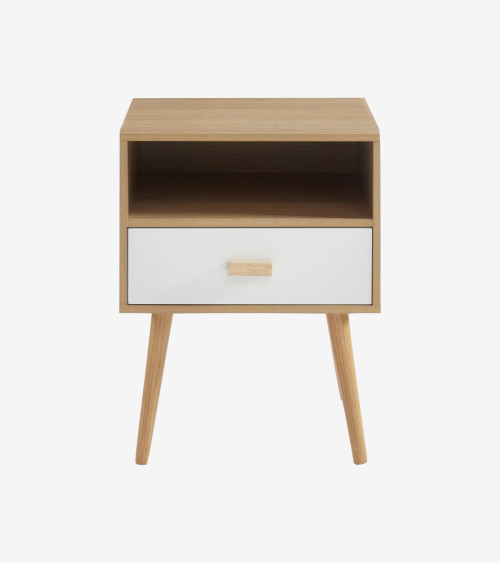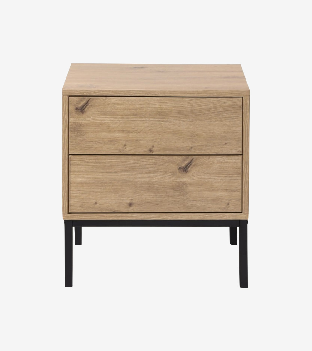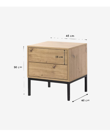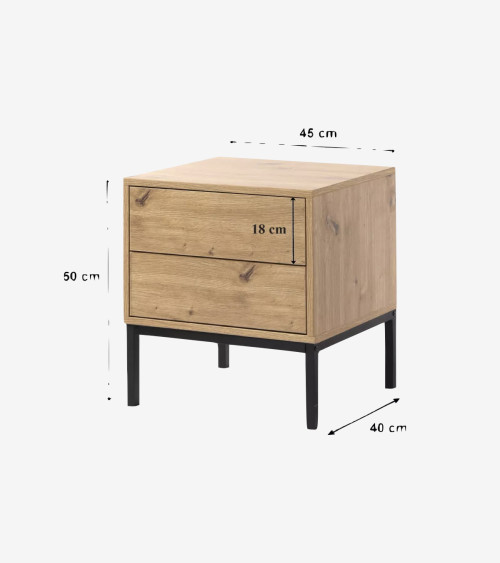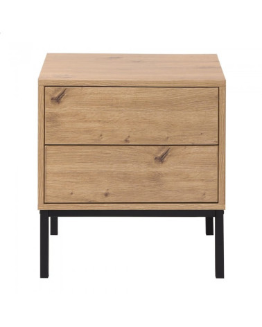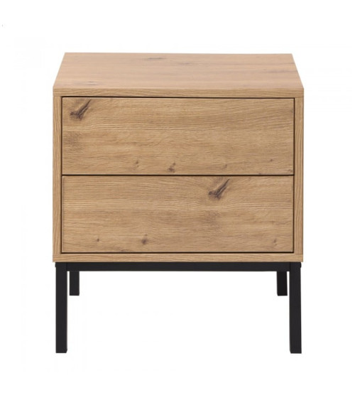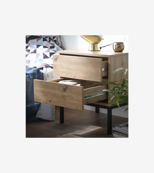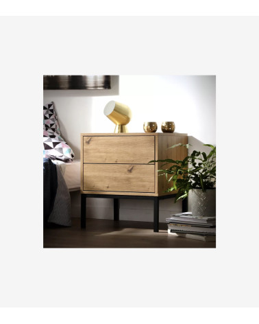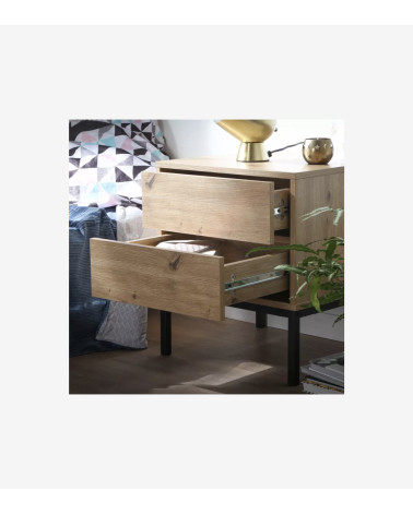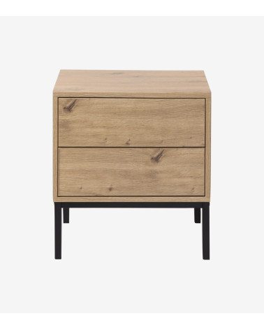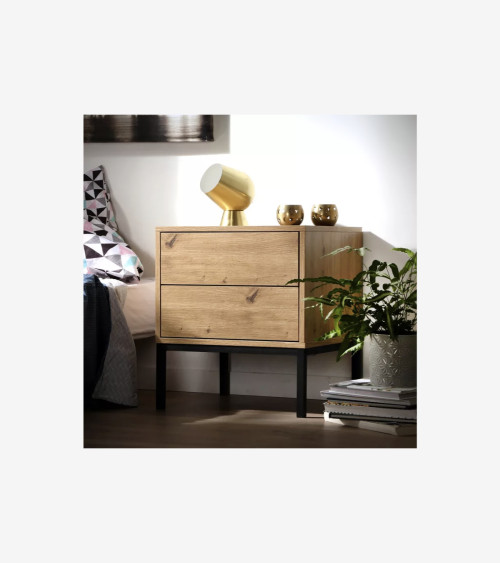 Cette table de nuit est fabriquée avec des panneaux de particules solides recouverts d'un décor bois artisan pour apporter de la douceur. Les pieds sont en métal pour plus de stabilité et de caractère.