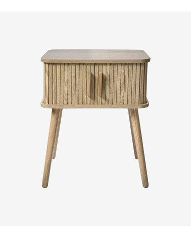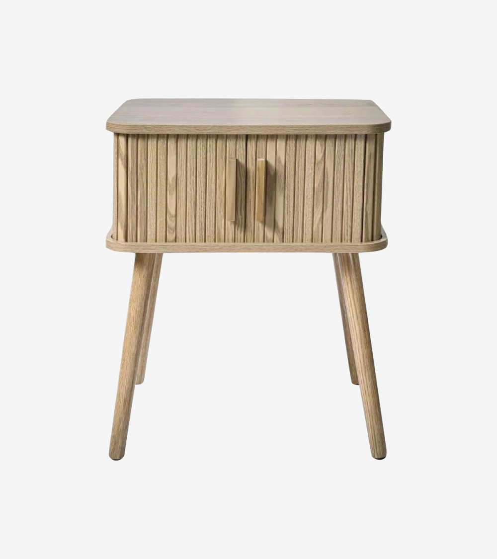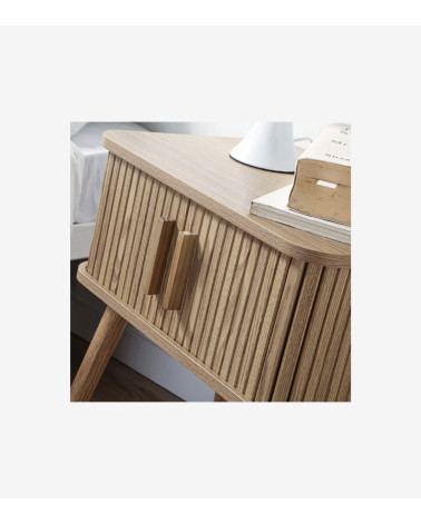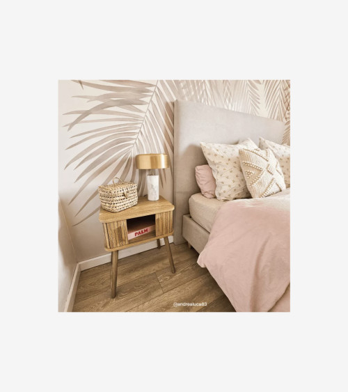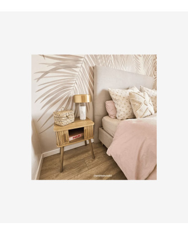 Elle est non seulement esthétique mais aussi fonctionnelle, grâce à ses deux portes coulissantes qui permettent de ranger vos objets personnels à l'abri des regards. Sa couleur bois clair s'harmonise facilement avec divers styles de décoration intérieure.