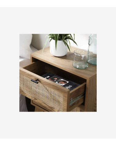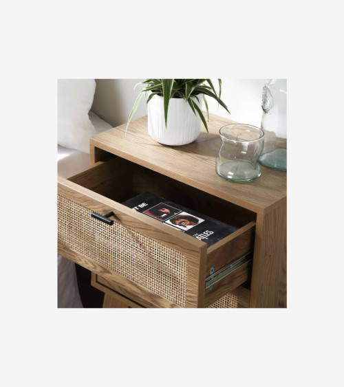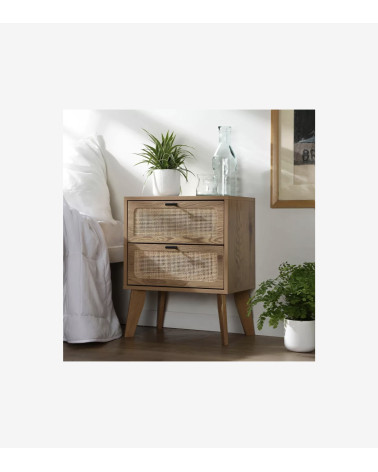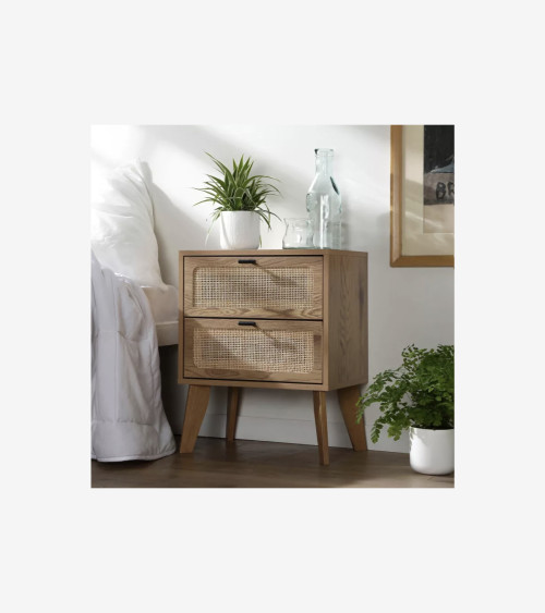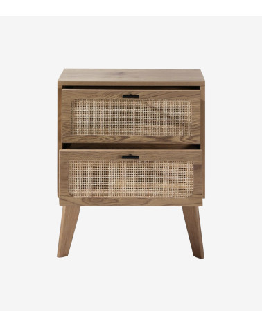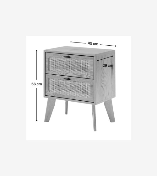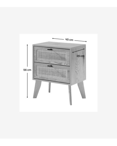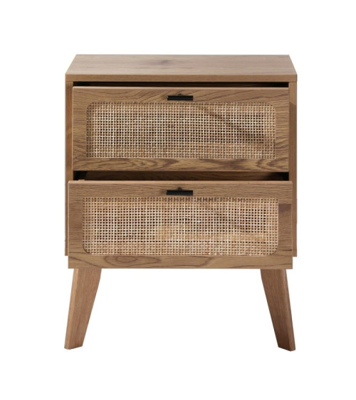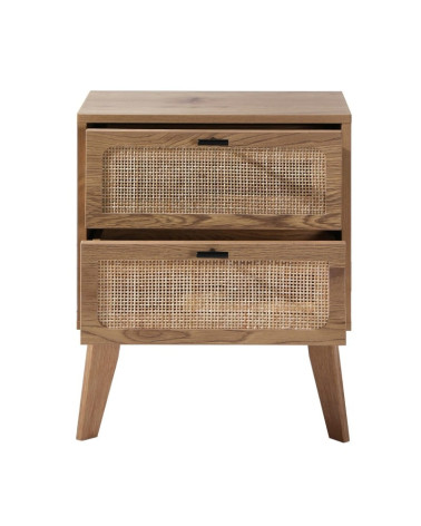 Chevet 2 Tiroirs décor bois avec Façades en Rotin L 45 cm x P 29 cm x H 56 cm