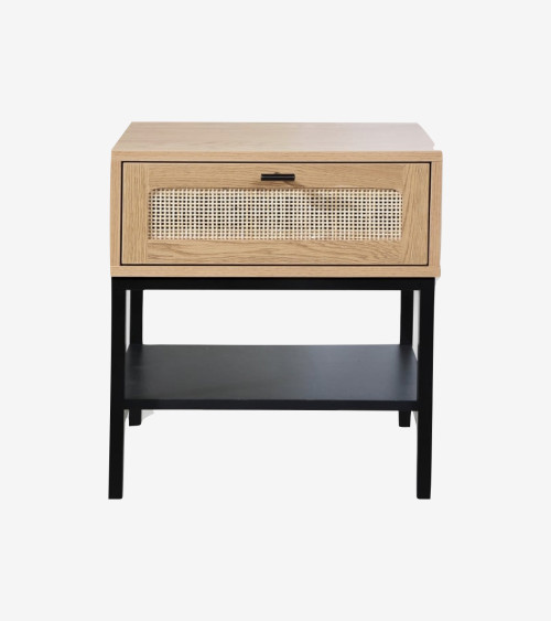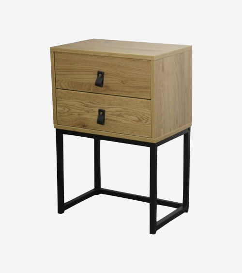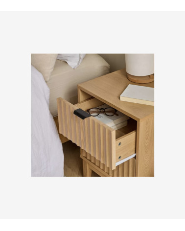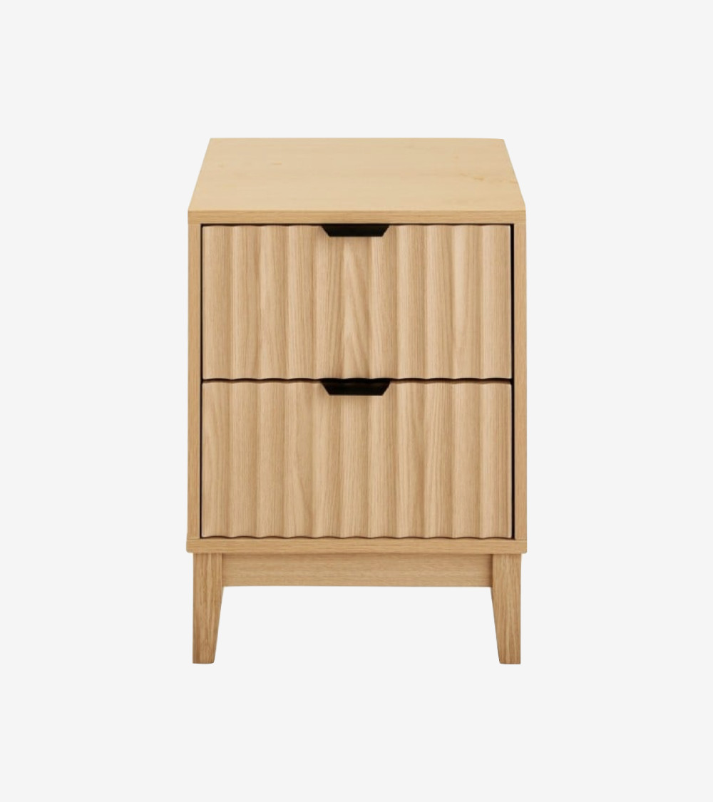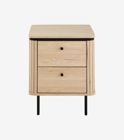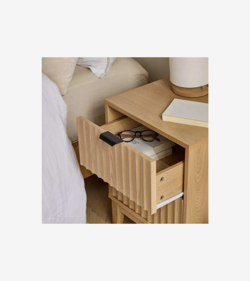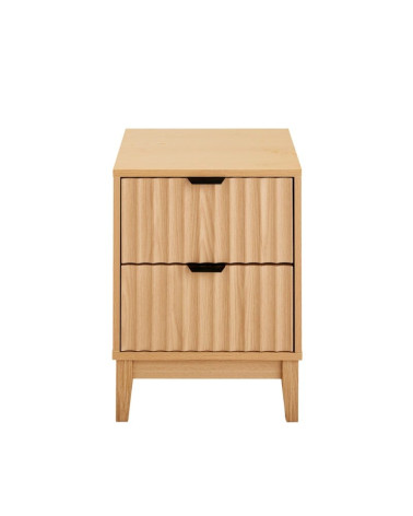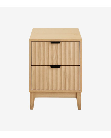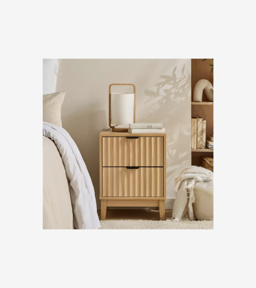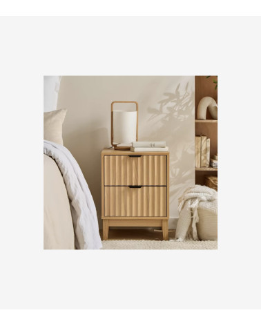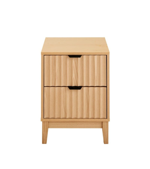 La table de chevet est un meuble élégant et fonctionnel, idéal pour compléter votre chambre. Elle est dotée de deux tiroirs avec façades à effet cannelé, ajoutant une touche de sophistication à votre espace. Les poignées en métal noir contrastent joliment avec le bois clair, offrant un design moderne et épuré.Fabriquée en panneaux de particules avec des façades en MDF, cette table de chevet est robuste et durable. Les pieds sont en bois d'hévéa massif, assurant une stabilité optimale. Les tiroirs sont équipés de coulisses à galet pour une ouverture et une fermeture faciles